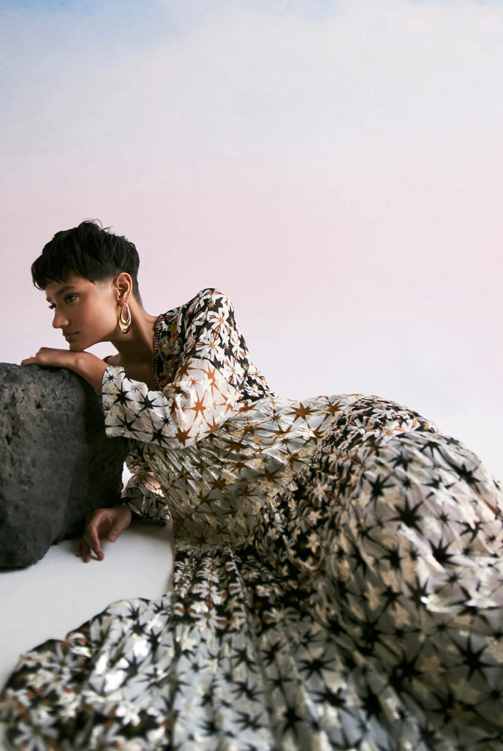The line captures the conflict between tradition and modernity by using prints and techniques inspired by history wrapped in silhouettes and fabrics of urban international trends.