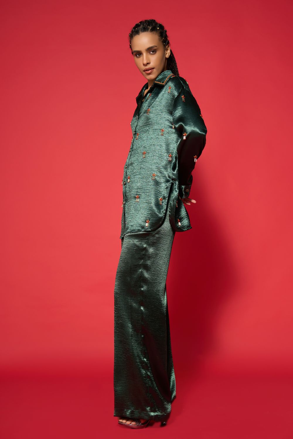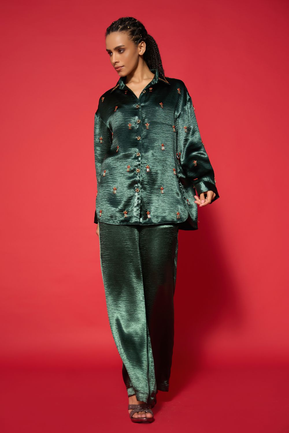This exquisite green satin co-ord set combines effortless elegance with artisanal charm. this stunning green satin button-down shirt is beautifully enhanced with delicate embroidered motifs scattered thoughtfully across the fabric.Perfect for both formal occasions and chic casual outings.