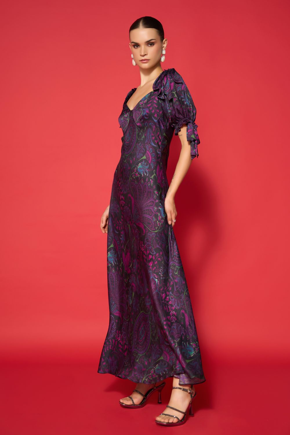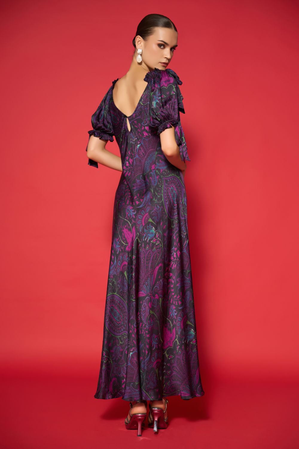 This is a stunning floor-length elegant printed gown with a fitted bodice, sweetheart neckline, and puff sleeves tied with bows. The rich jewel-tone paisley pattern gives it a sophisticated yet bold appeal. The silhouette is slightly fitted through the bodice and hips, gently flaring out towards the hem for an elegant and flowing shape. Perfect for evening cocktails, formal dinners or social gatherings