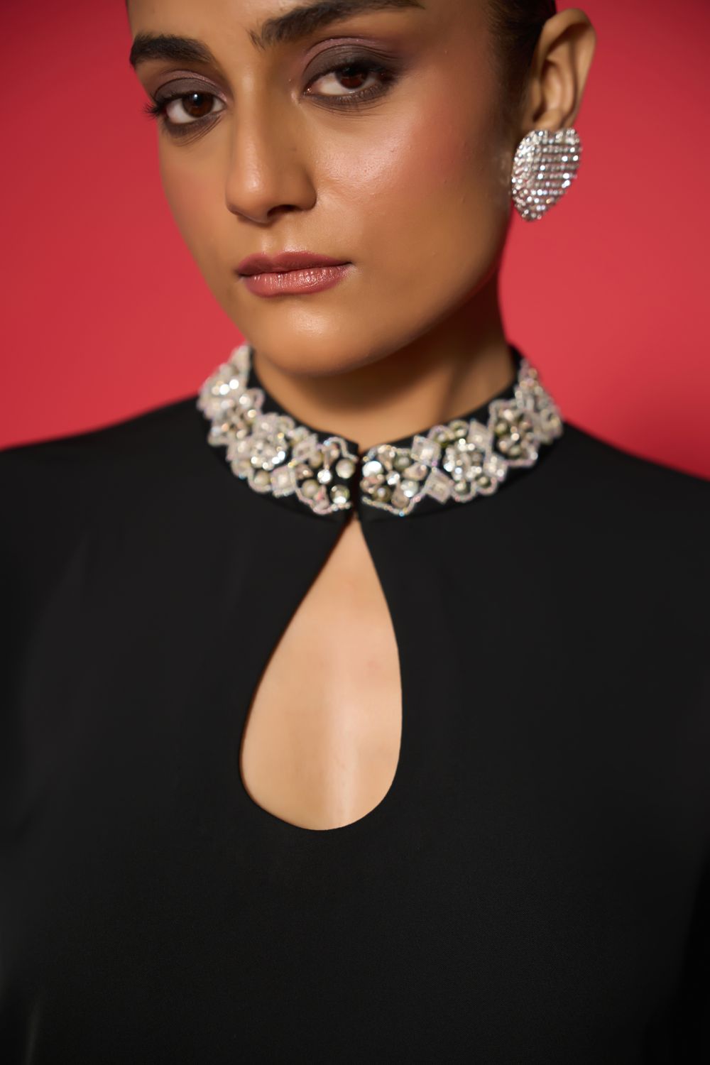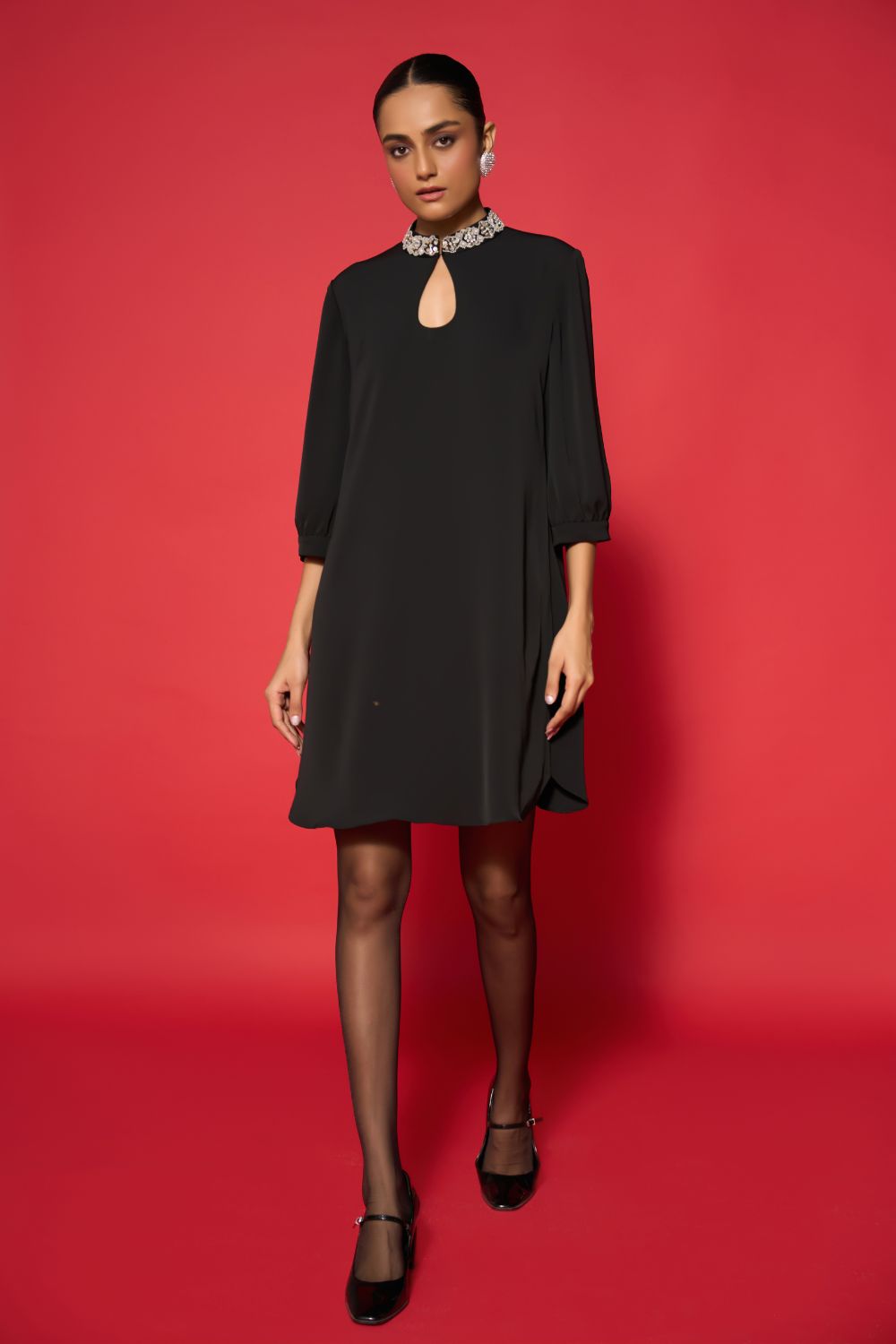 This is a chic and sophisticated black mini shift dress featuring a high embellished neckline with a key hole cutout lending a modern and stylish touch. Its three quarter sleeves with slight volume at cuffs is keeping the look refined. Perfect for evening cocktails, formal dinners or social gatherings.