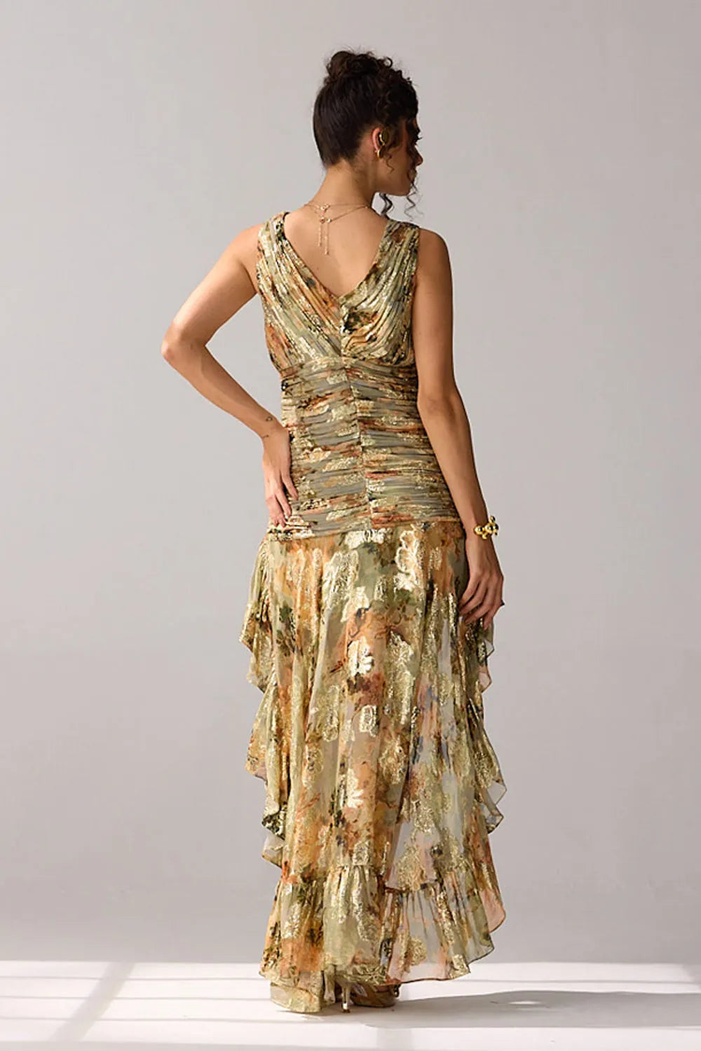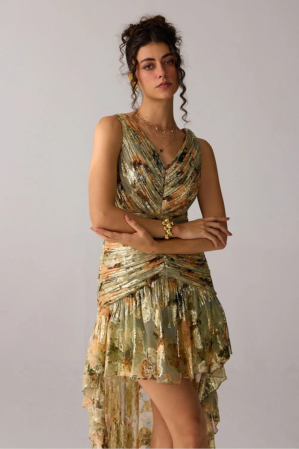 A printed high-low lurex dress, featuring flattering ruching that adds texture and movement with a dramatic hemline that creates a striking silhouette, perfect for making a statement everywhere you go.
