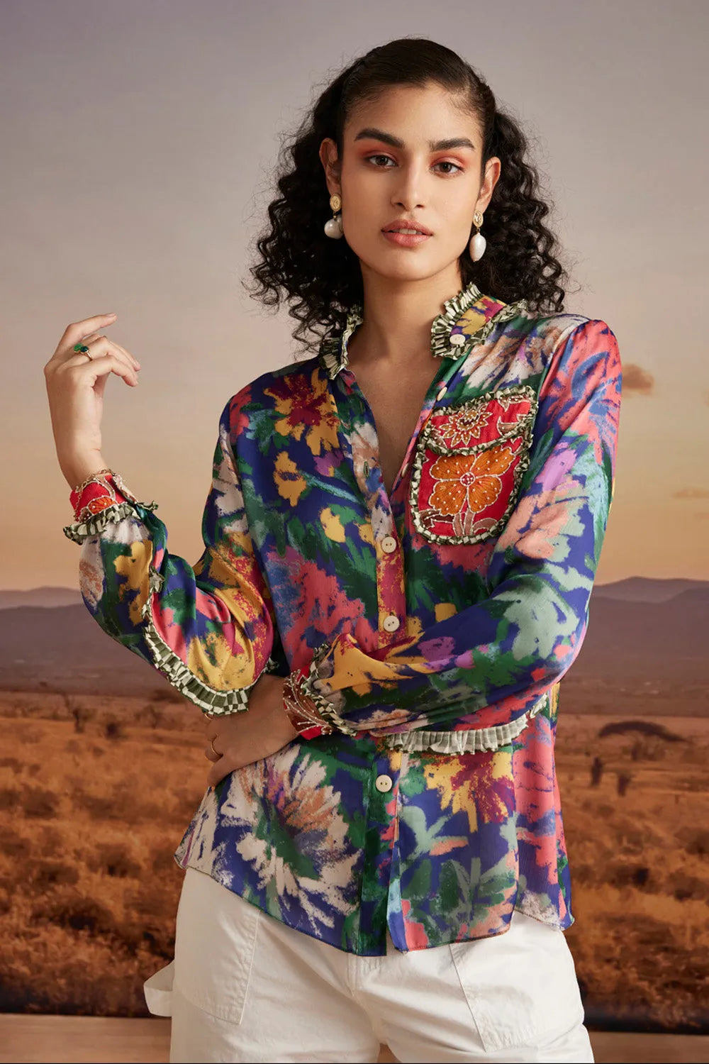 Dive into a sea of style with the Arisha Blouse in cobalt blue. It's not your average shirt – featuring playful fringe details, a fun printed pattern, and even an embroidered pocket. The ruffle pleated sleeves add an extra touch of flair.