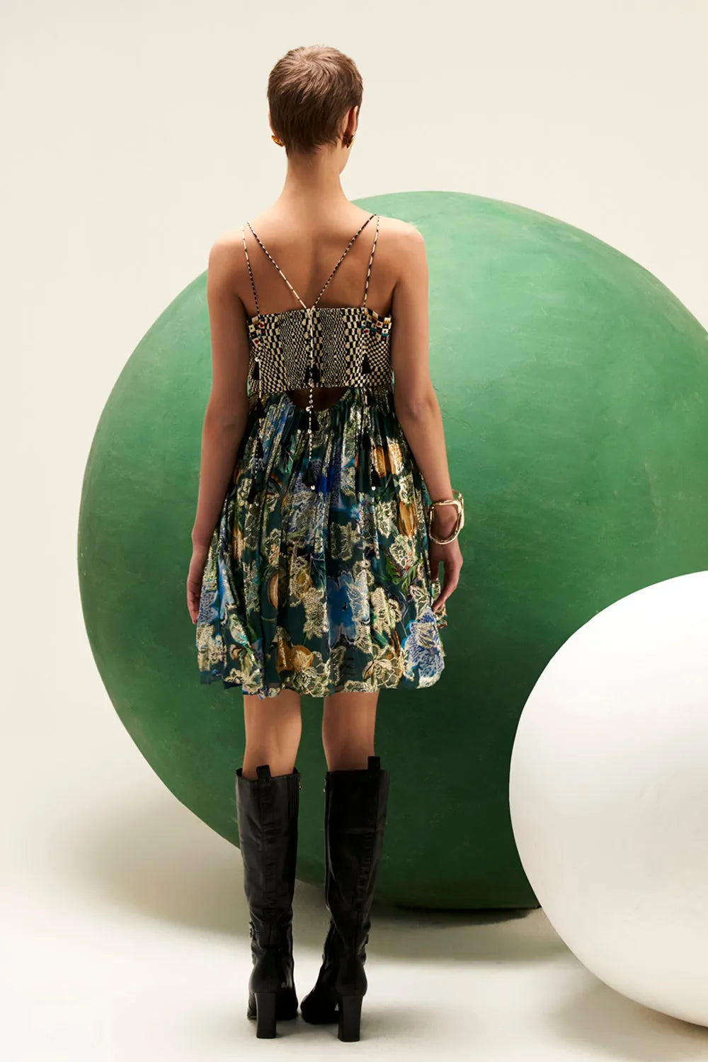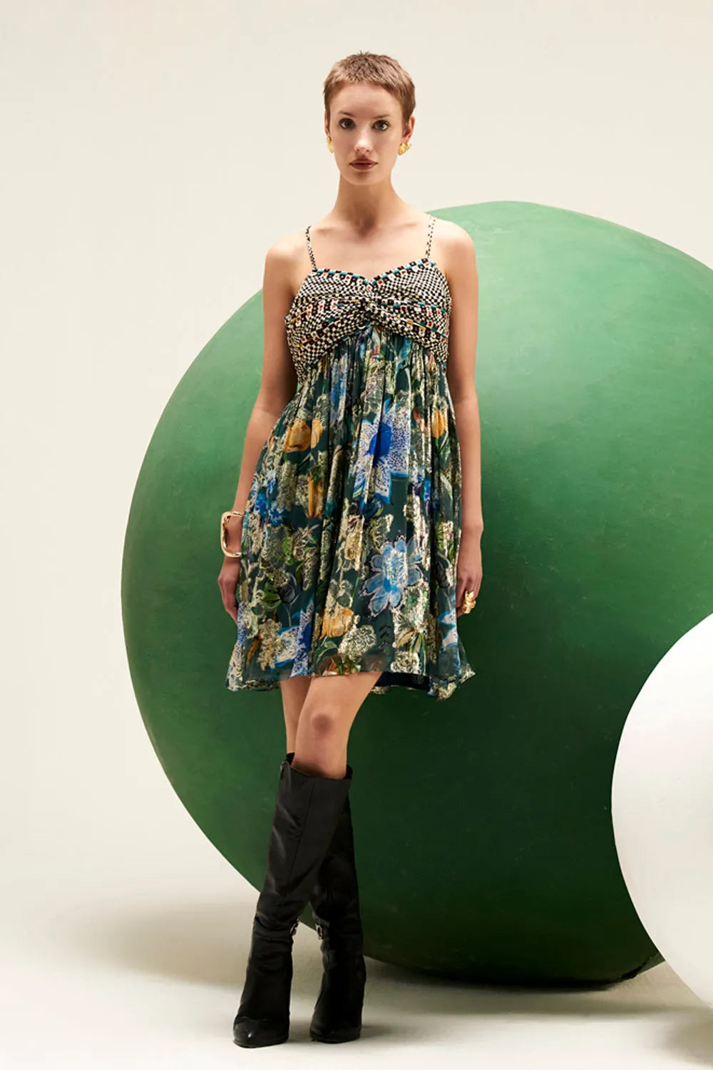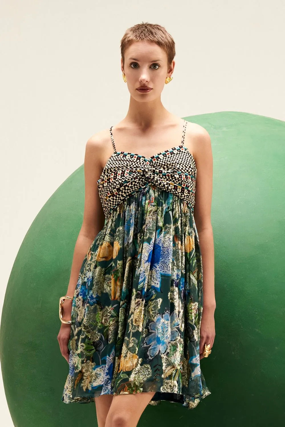 Get the best of floral print and a flirty mini dress in this lovely lurex beaut perfect for your vacay mood.