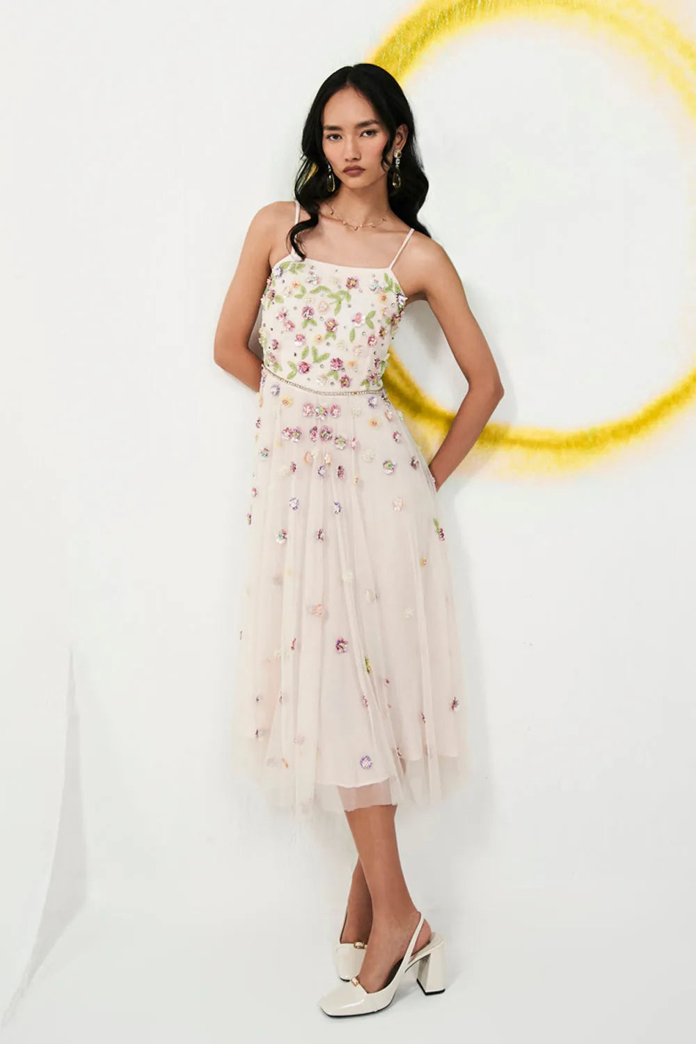 Floral embroidered sequenced 3d tulle dress in nude pink.