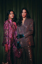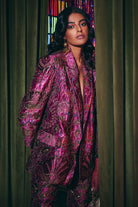 Make a bold statement with the Ramona Jacket & Pants Set. The ruby pink velvet fabric is adorned with thread sequence detailing, adding a touch of glamour and elegance. This co-ord set is perfect for parties, exuding a luxurious and sophisticated vibe. Pair it with a dress or high-waisted pants for a stunning and fashionable look.