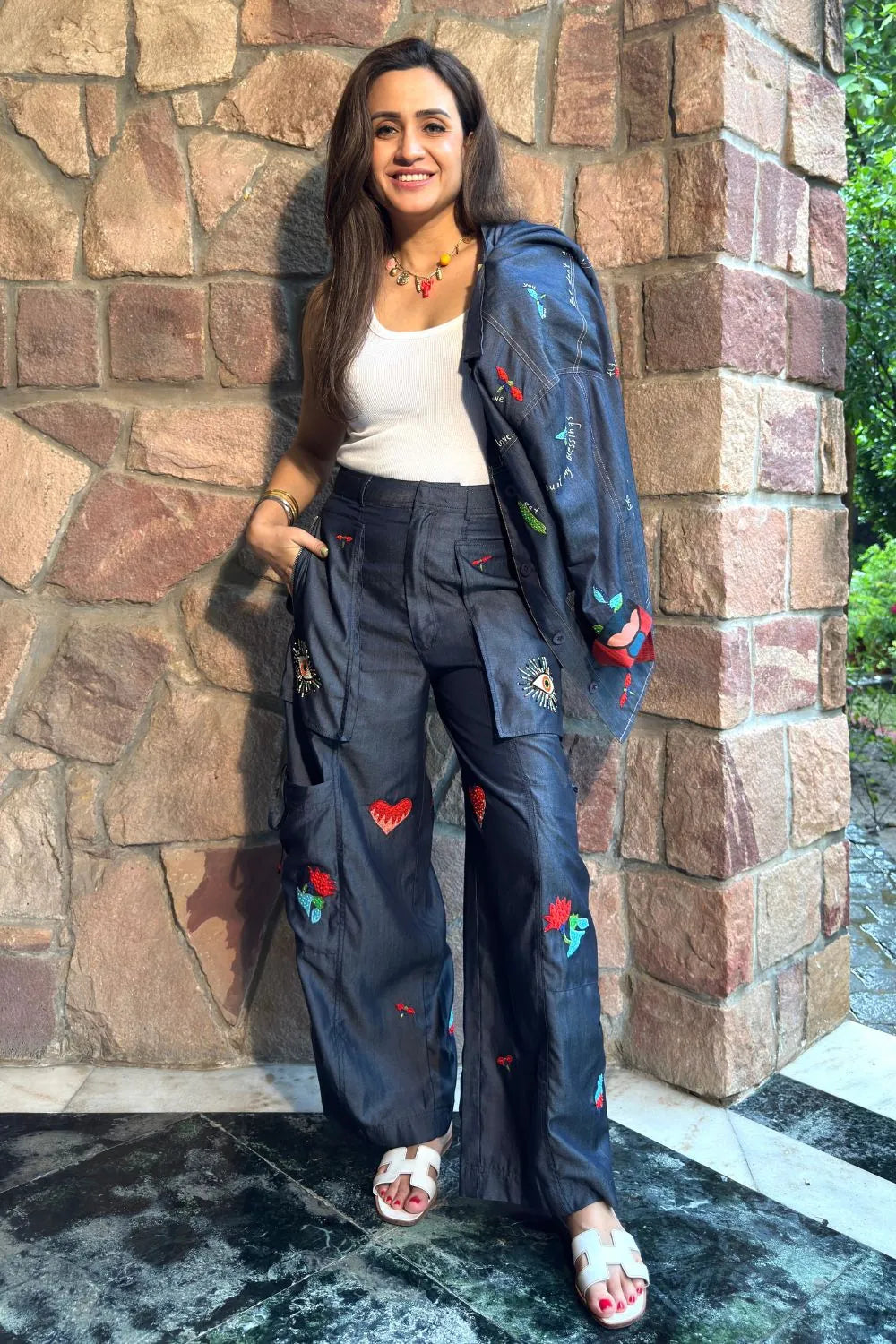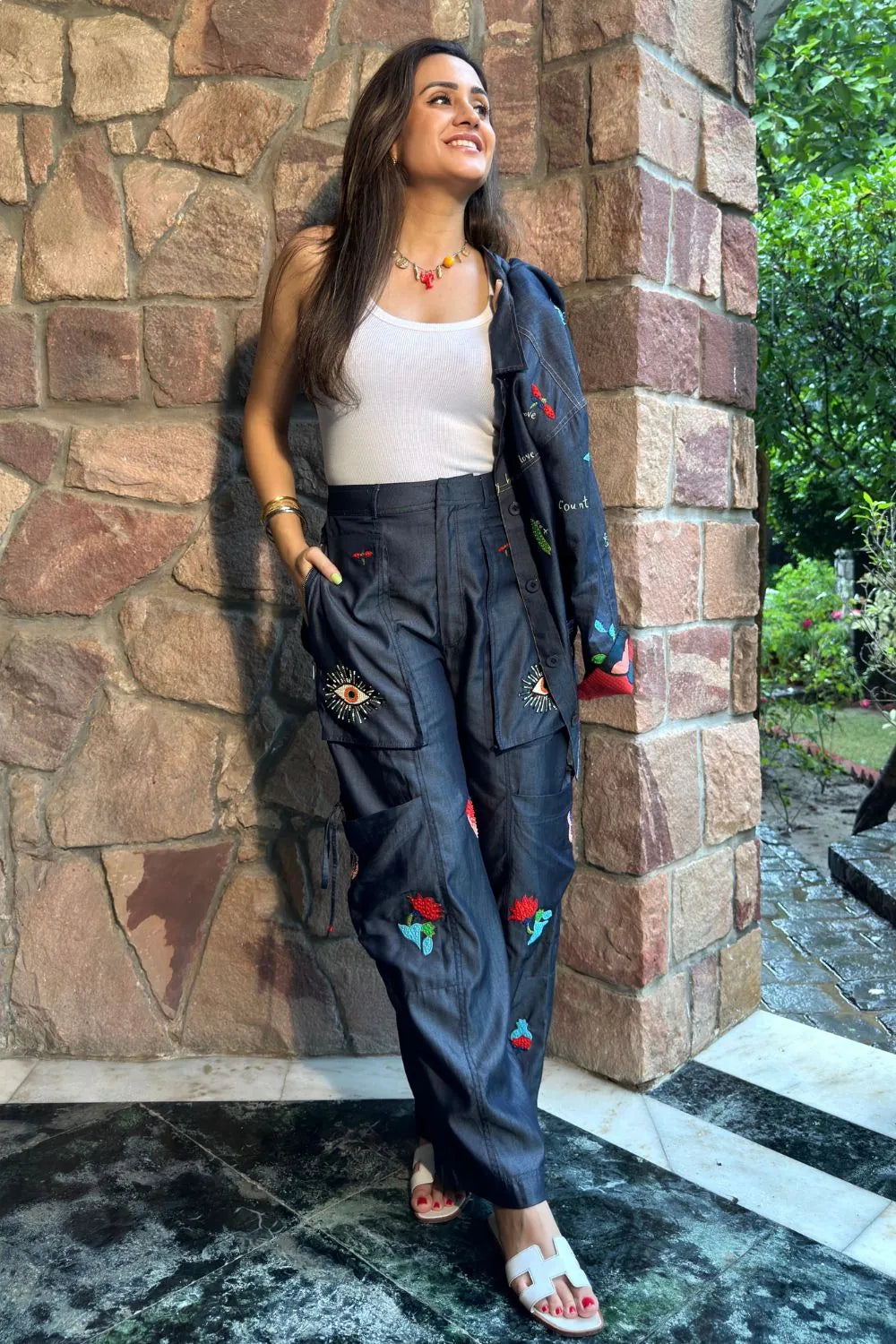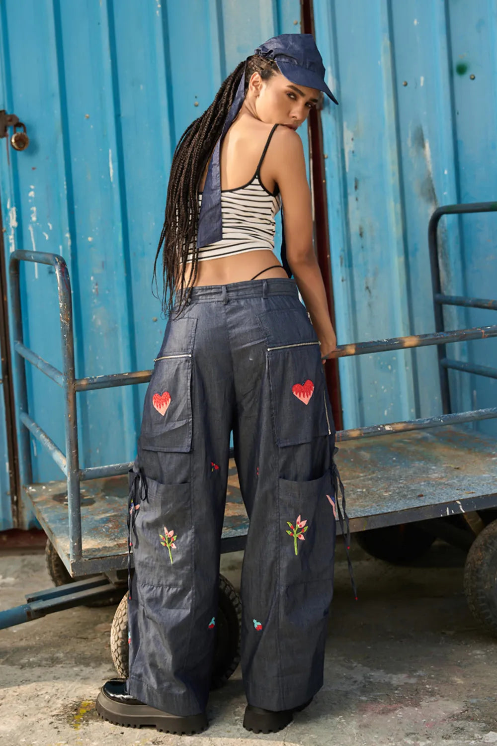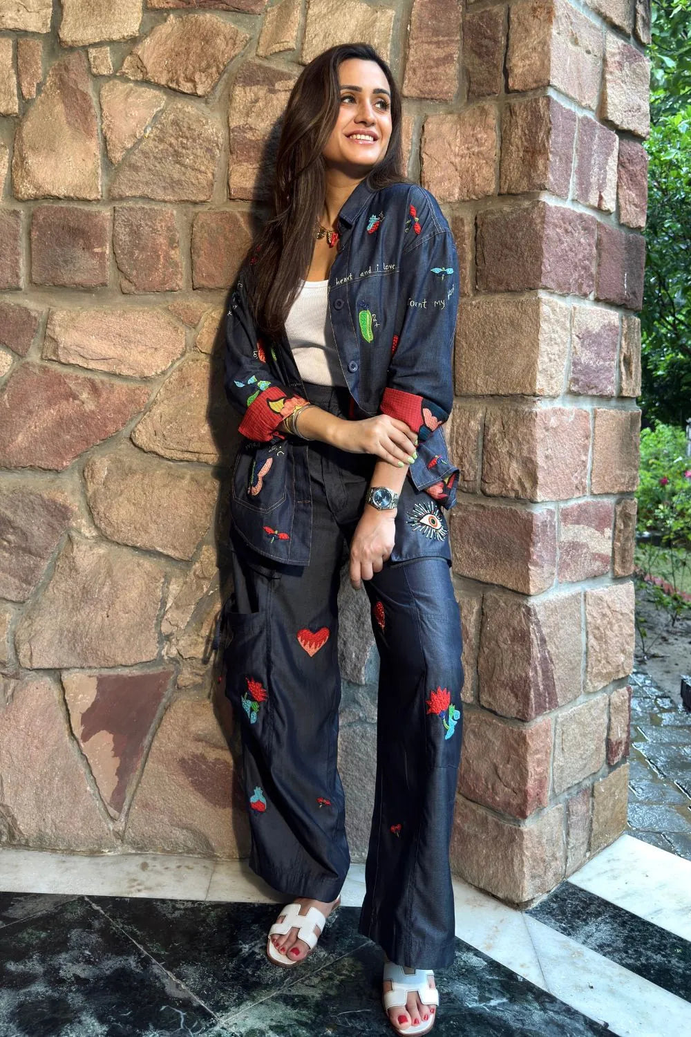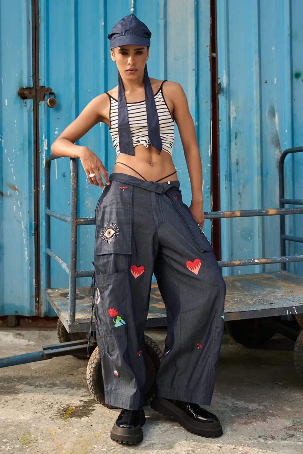 This is a dark denim button-down shirt featuring playful, colorful embroidery which includes butterflies, hearts, fruits, and small text phrases like “mariposa magic” and “forever and ever u will stay…”. The shirt has a structured yet relaxed fit with long sleeves and two oversized front patch pockets that also carry embroidered designs. These are paired with relaxed-fit, wide-leg denim cargo pants featuring playful, multicolored embroidered motifs, including hearts, flowers, and an eye design on one leg. The pants have multiple utility-style pockets, adding both functionality and an edgy streetwear vibe. Perfect for casual outings, music festivals, or laid-back weekend wear