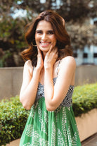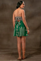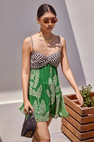 Add a pop of color to your holiday wardrobe with our Stippling Printed Mini Dress in a vibrant leaf green shade. Crafted from lightweight viscose georgette, this mini dress ensures you look Uber cool.