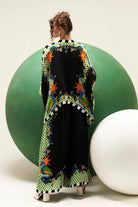 Take the world by storm in this black checkered cape blouse featuring Verb's signature animal print.