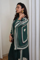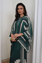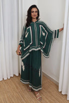 This emerald green geometric printed cape blouse is a one-size-fits-all design, offering a flowy, flattering silhouette. Perfect for transitioning from resort wear to a chic day-to-night look with ease.