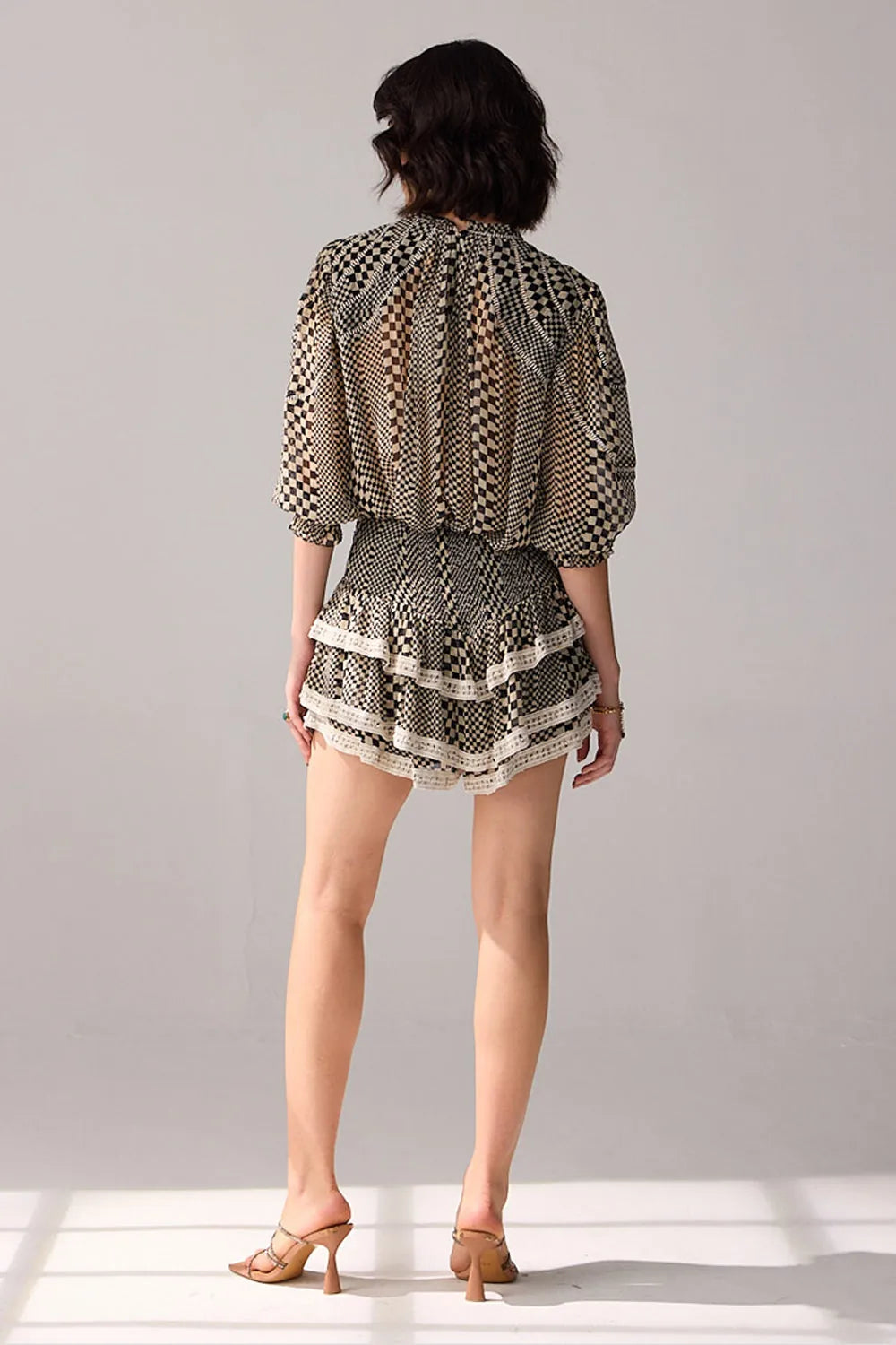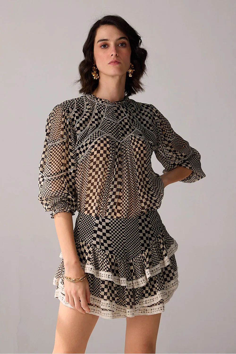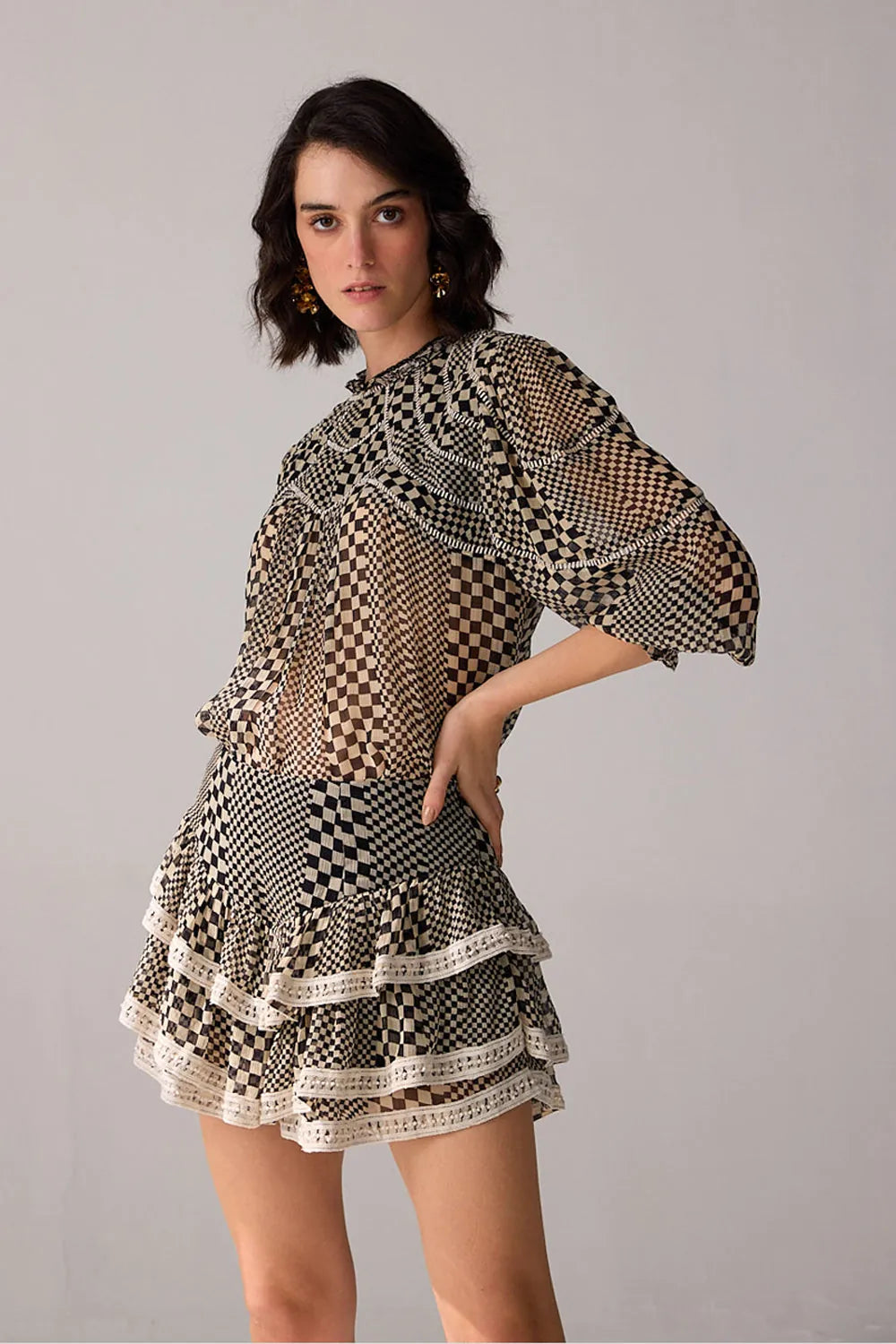 Make a statement with this stylish co-ord set, featuring a checkered printed blouse adorned with delicate lace detailing. Paired with a divided mini skirt, this set combines classic patterns with modern design for a chic and fashion-forward ensemble.