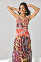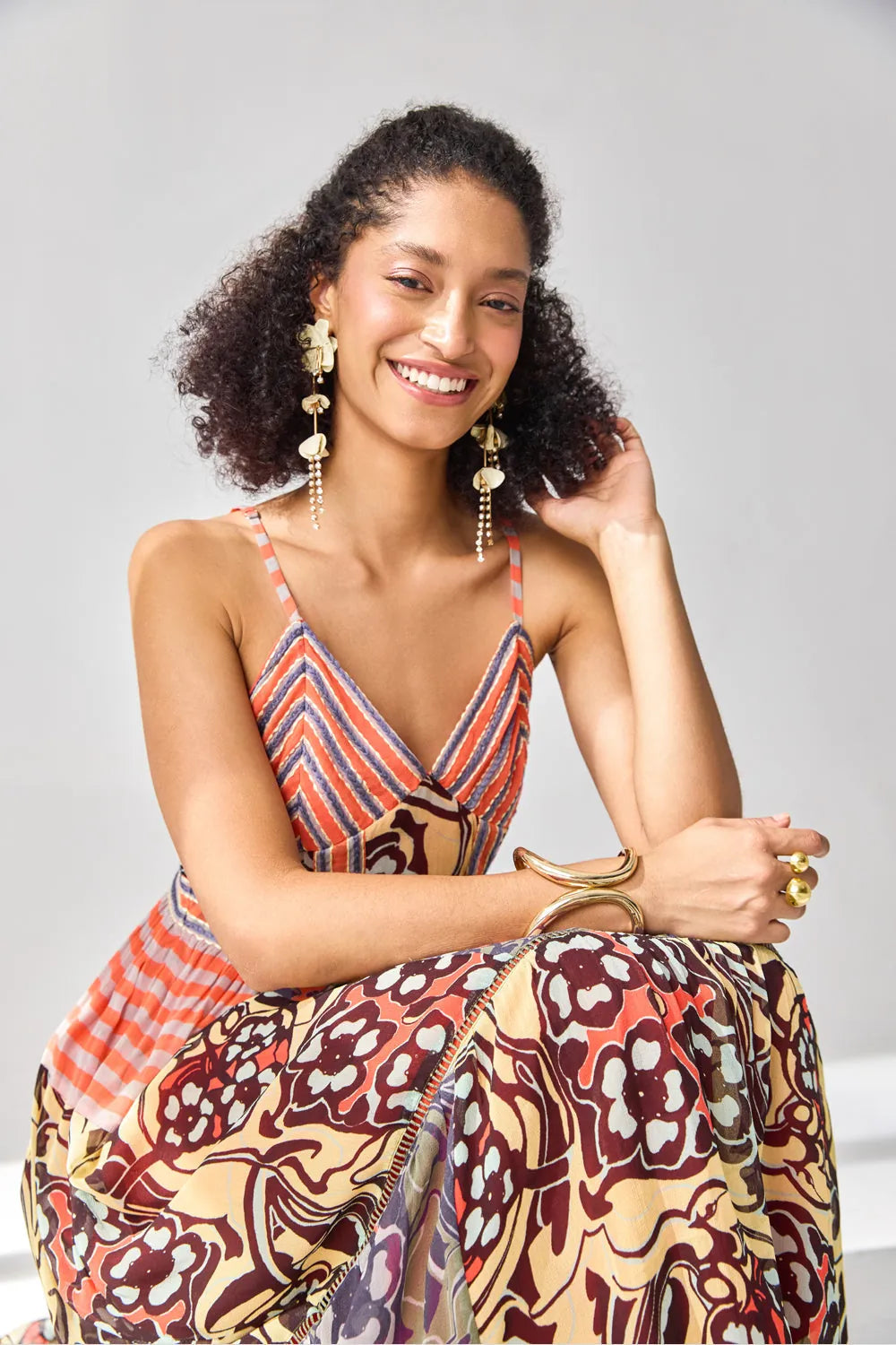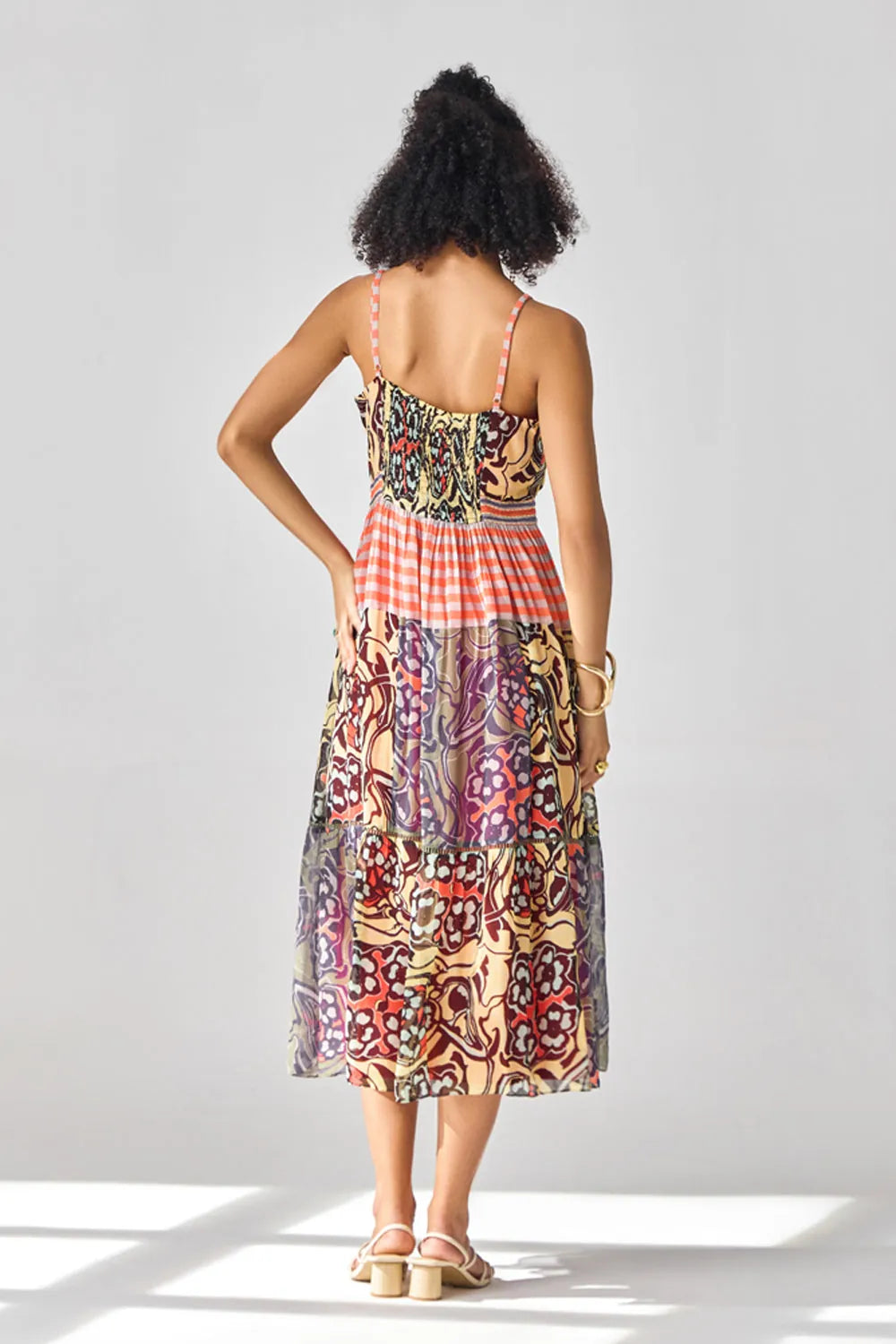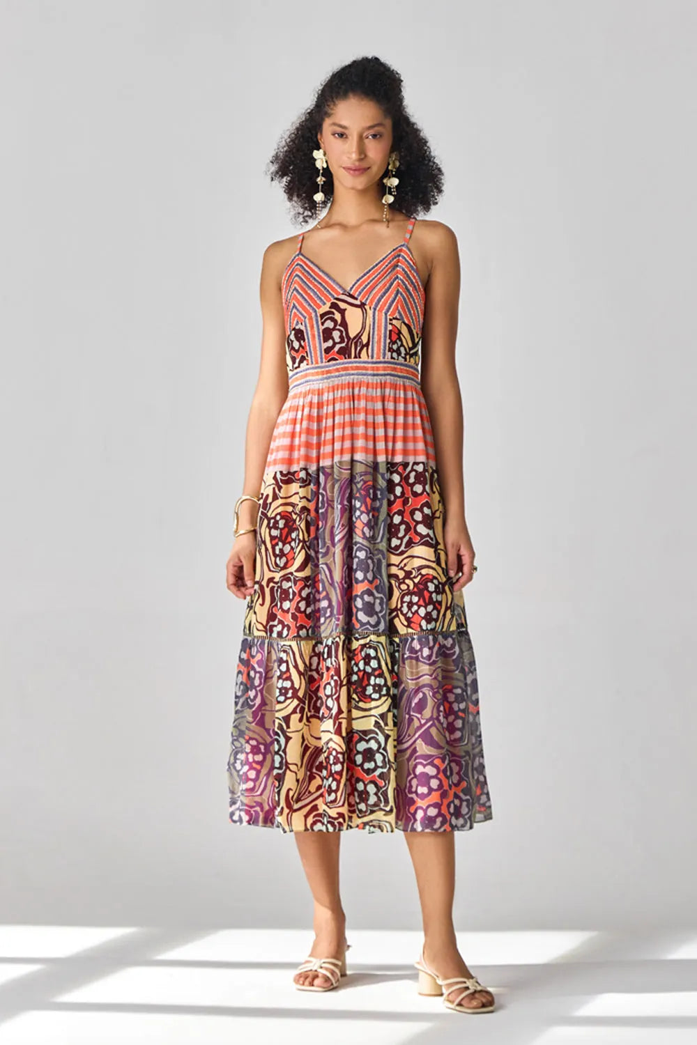 A vibrant, multicoloured spaghetti dress featuring delicate stitch detailing on the yoke that adds a subtle touch of texture to its breezy silhouette.