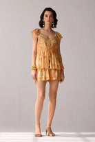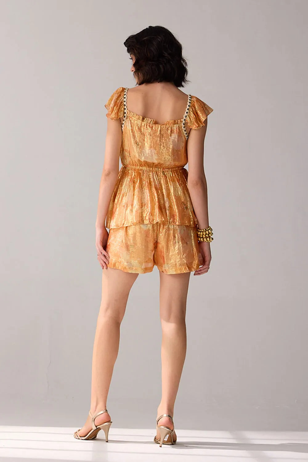 A glamorous co-ord set that exudes confidence and charm for the diva that you are. The set features a golden, striped blouse adorned with intricate lace and playful jharlar detailing which is paired with shimmering lurex shorts.