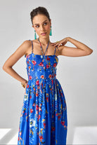 This corset-fitted maxi dress features an adjustable smocked back and beaded tie-up shoulder straps for a custom fit. Perfect for a summer getaway or a chic luncheon with friends, it combines style and comfort effortlessly.