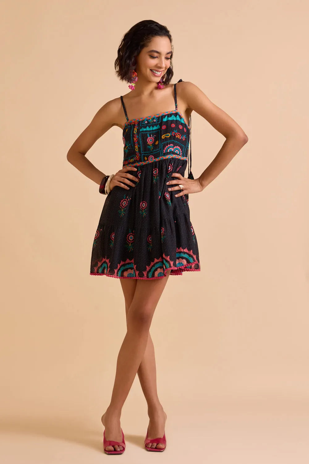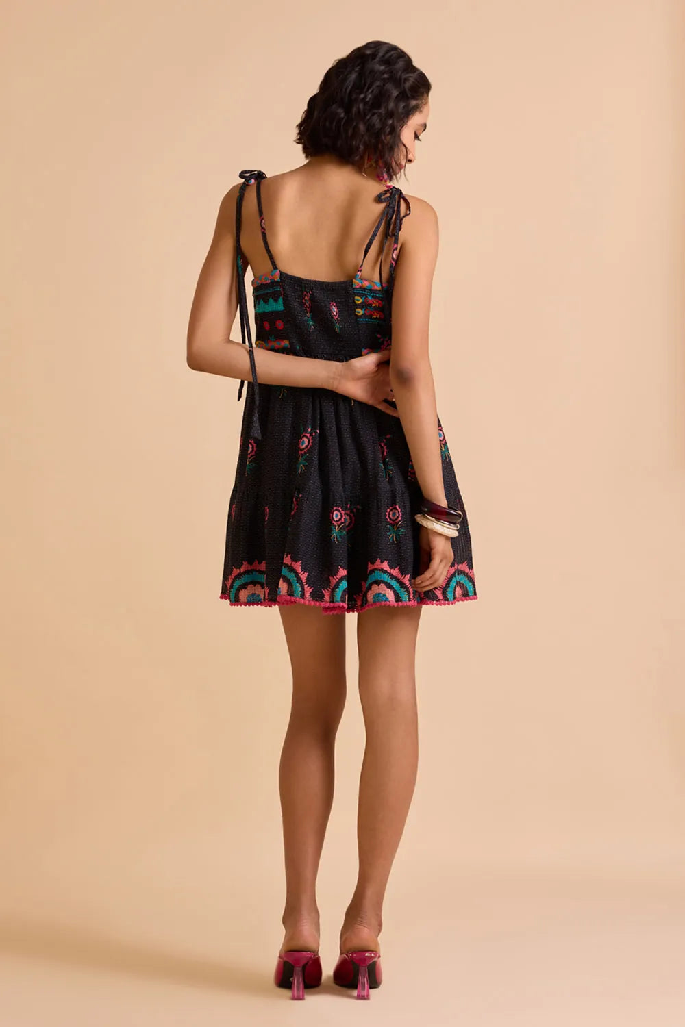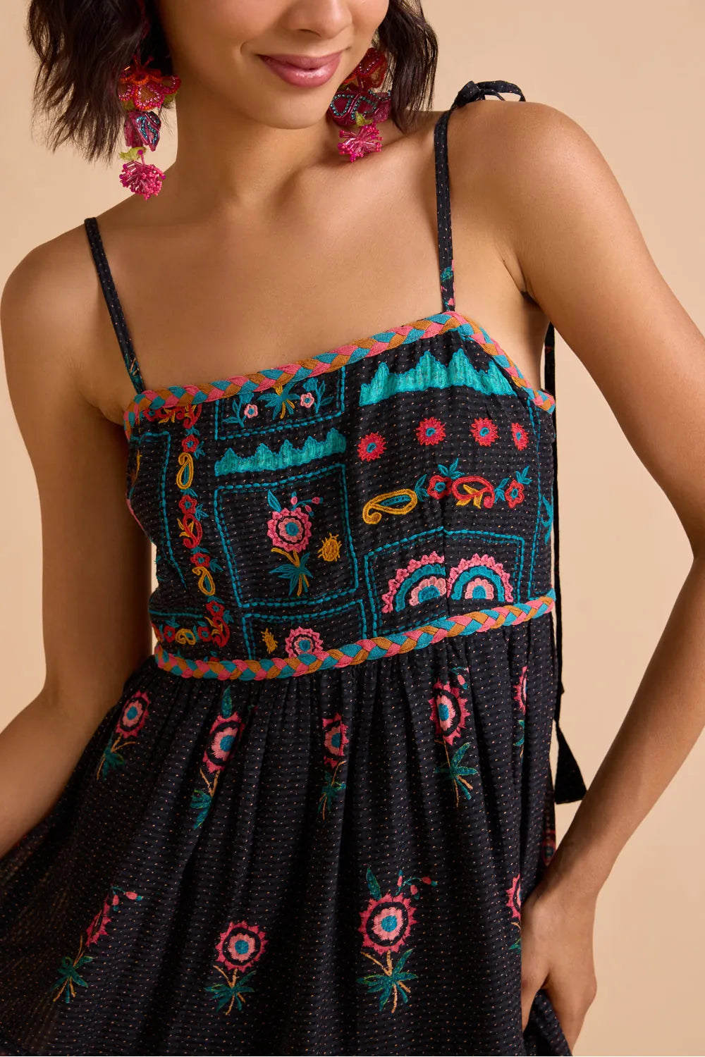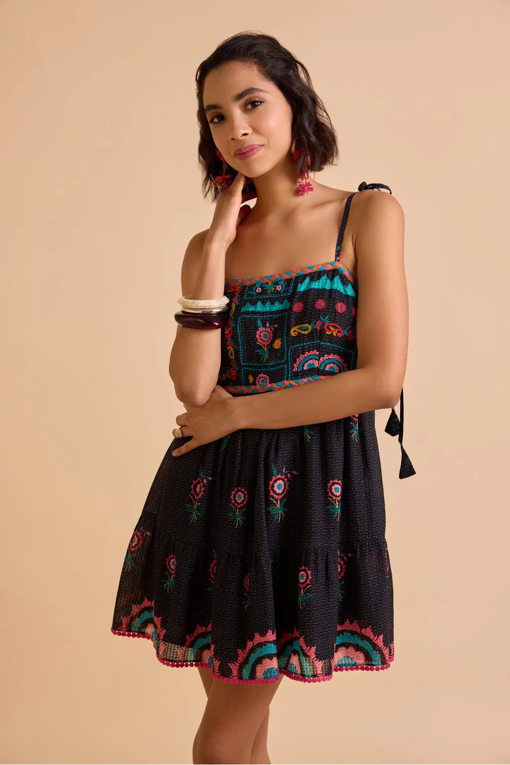 This flirty Black mini dress in voile features an embroidered torso and delicate braided detailing, offering a playful yet elegant look. Perfect for adding a touch of charm to any occasion.