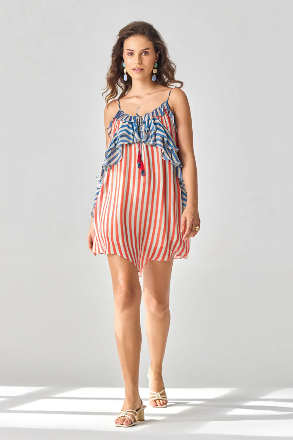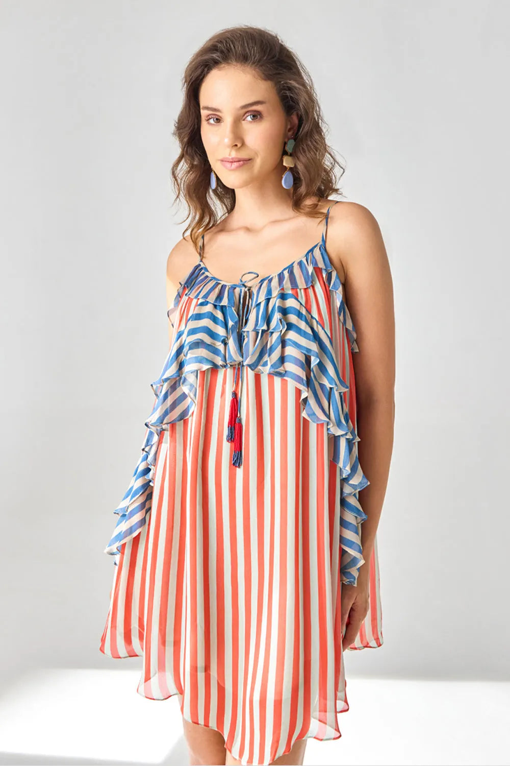 Discover vibrant style with our multicoloured striped tunic, featuring playful asymmetrical ruffles. This short dress combines dynamic stripes with elegant detailing, creating a lively yet refined look, perfect for any occasion.