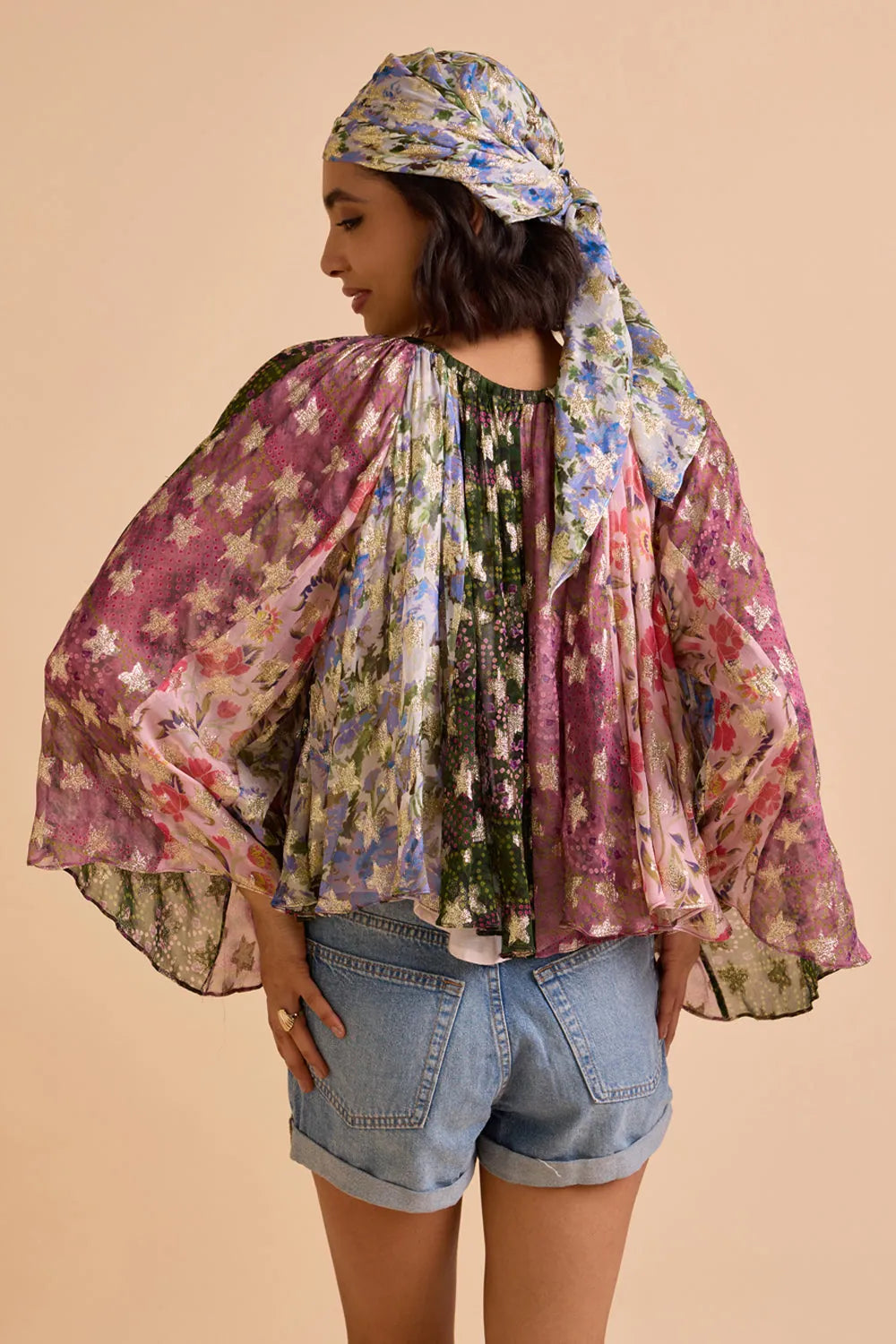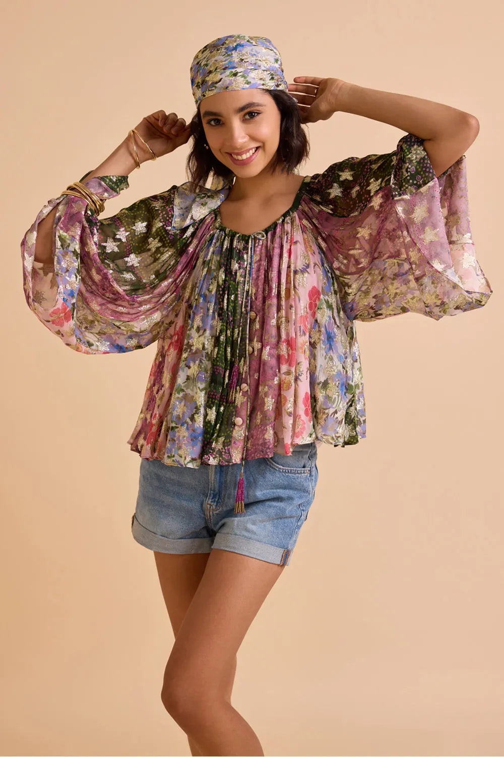This front-open color-blocked jacquard blouse is versatile and chic, perfect for layering or wearing on its own with trousers or shorts. Its bold design adds a stylish touch to any outfit.