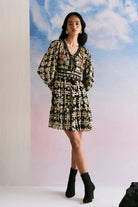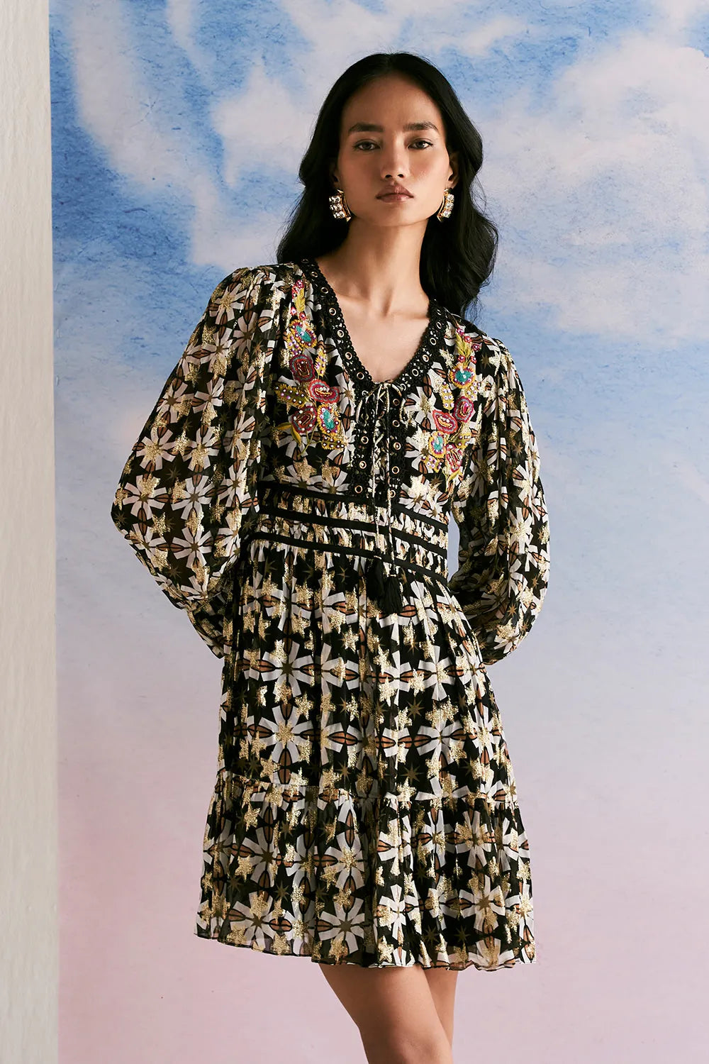 Waisted mini dress with an embroidered beaded yolk in lurex star print.
