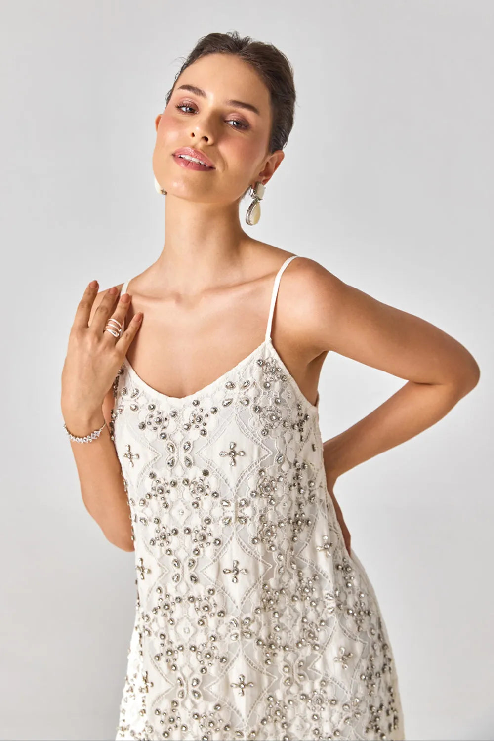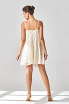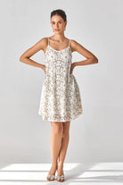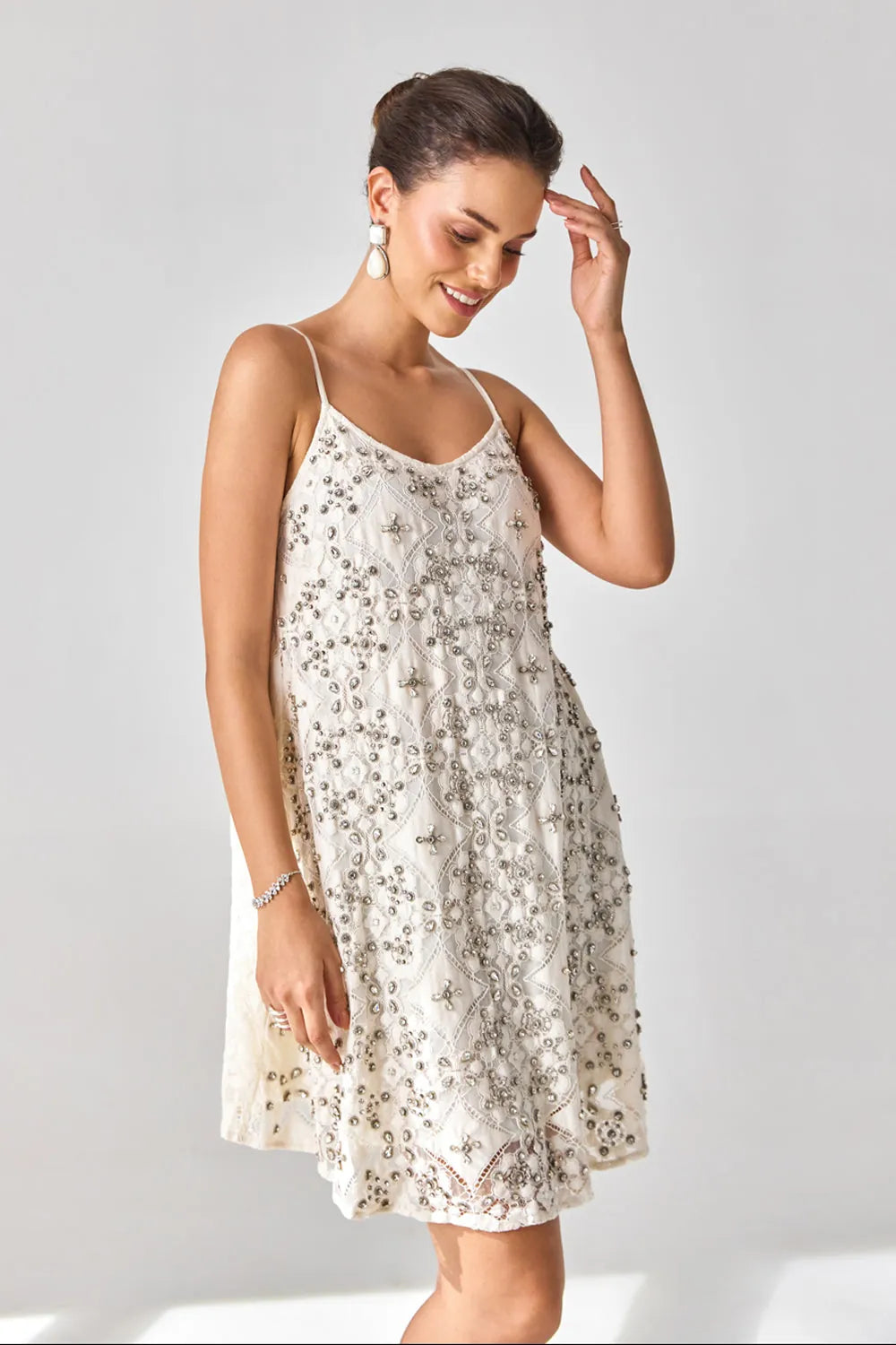 Sparkle at summer weddings and gatherings in this stunning ivory lace mini swing dress, adorned with crystal embellishments for a touch of glamour and elegance. Perfect for making a statement at any occasion.