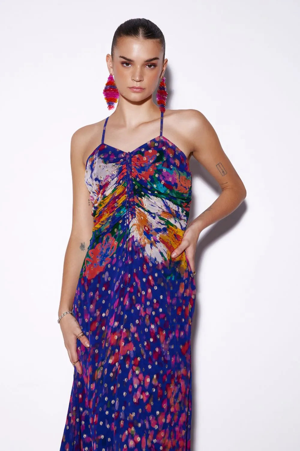 Ruched Jaquard Spaghetti Dress.