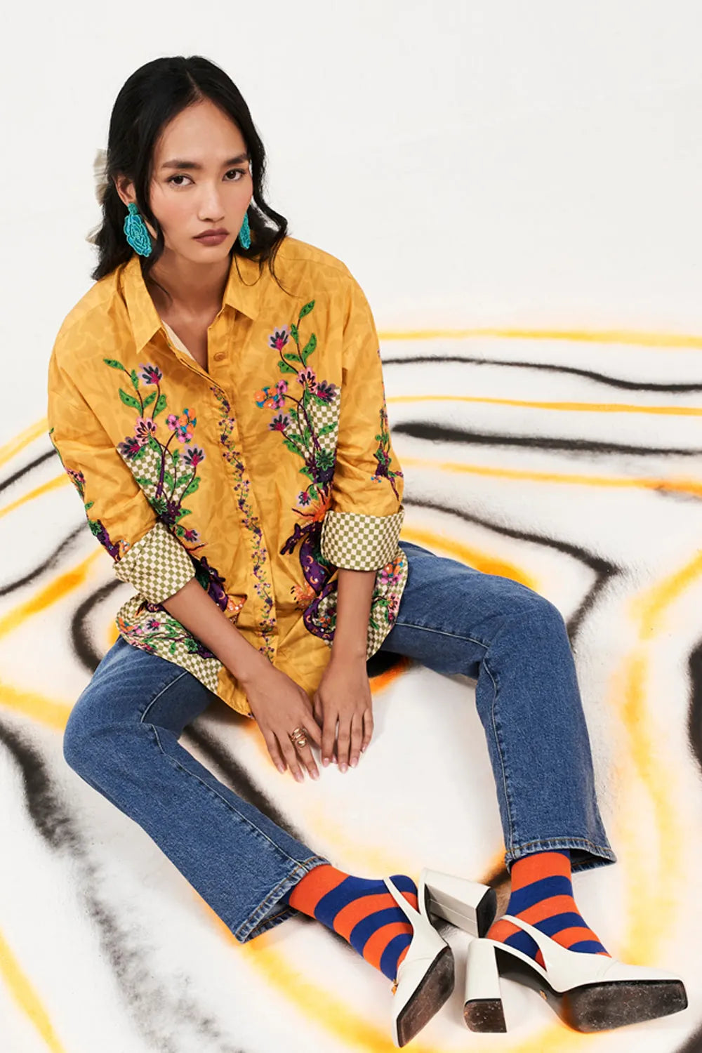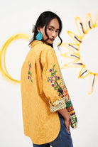 One size, placement printed sequenced beaded shirt with roll up cuffs in tangy mustard.