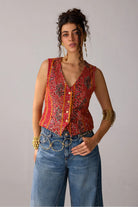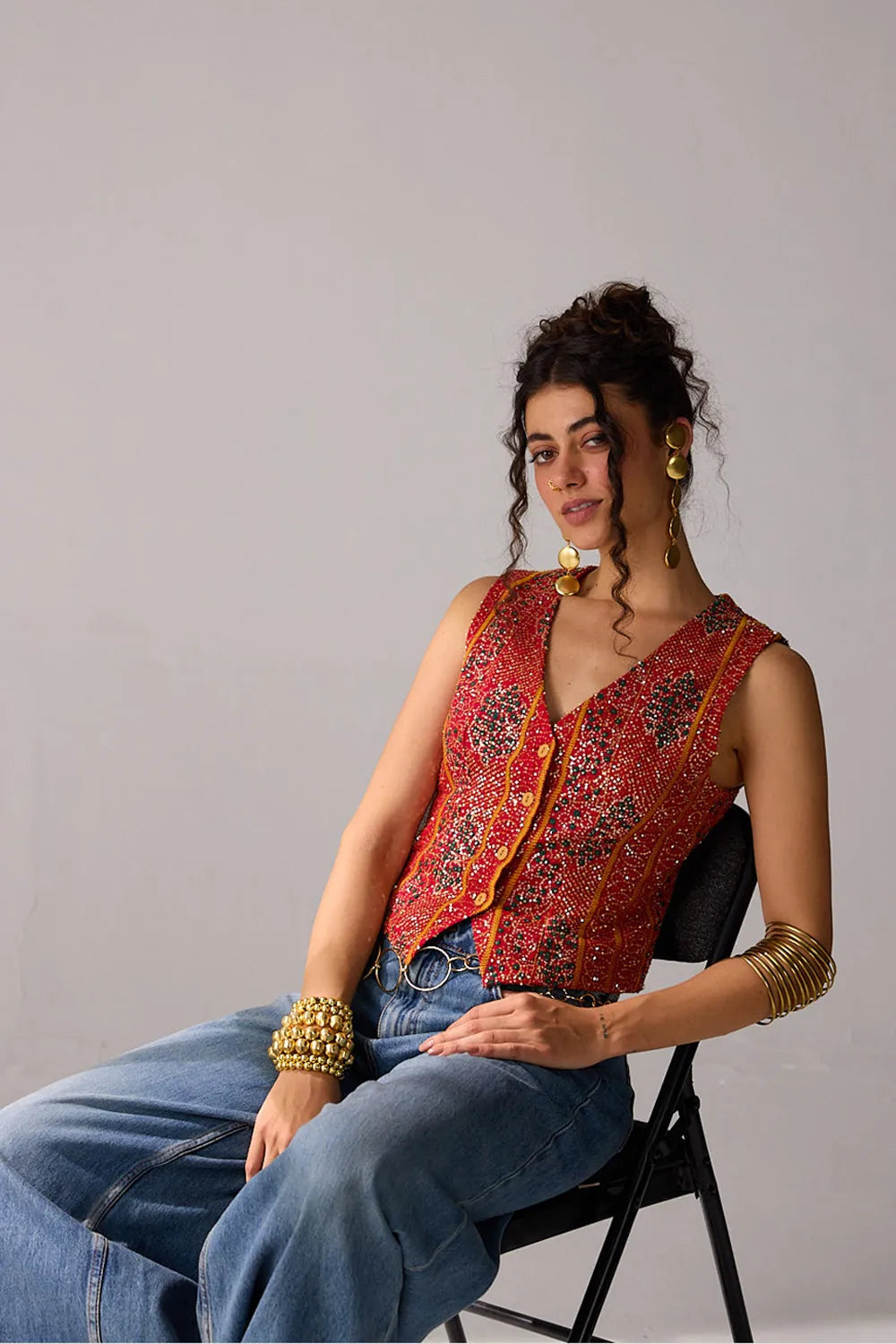 Flaunt a stunning blend of heritage and glamour with our printed Bandhni vest, featuring hand-embroidered sequin work all over.