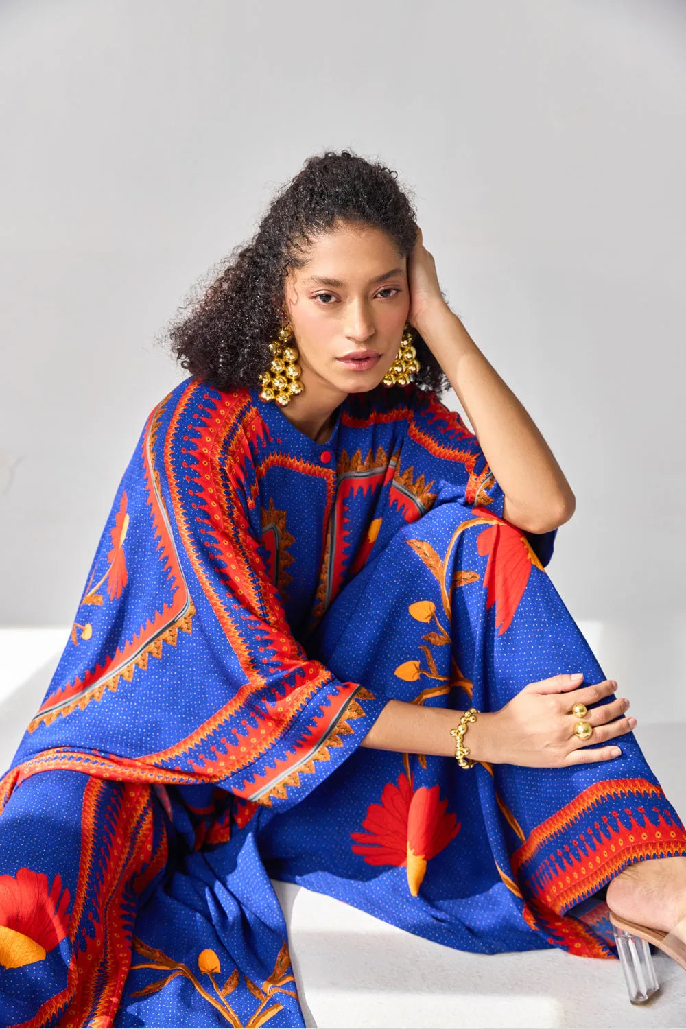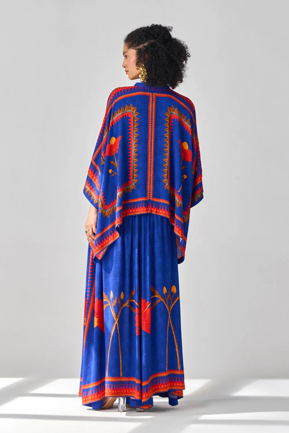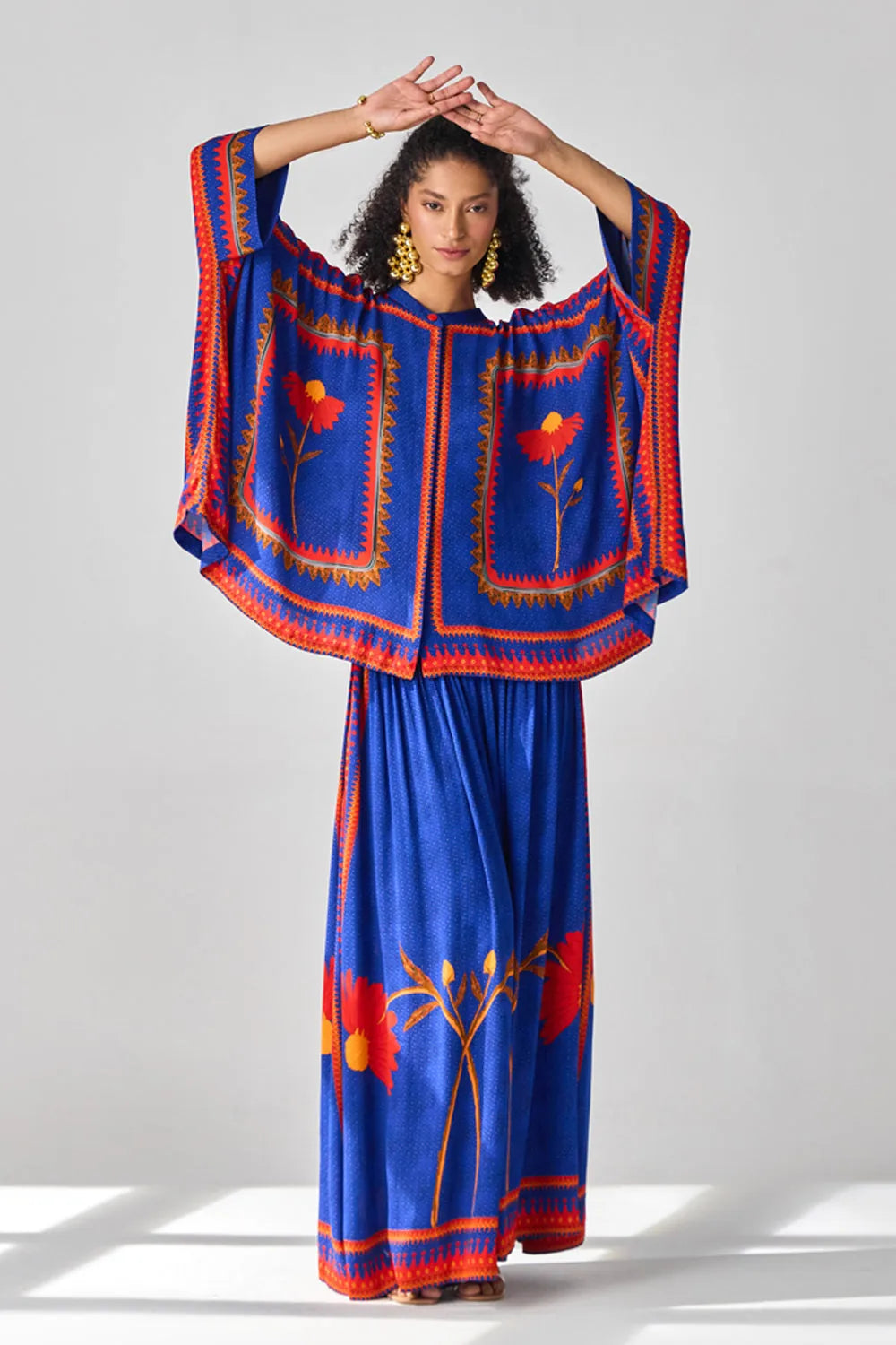 A blue geometric printed cape blouse that features a striking geometric pattern and a flowy design, blending modern pizzazz and effortless style, perfectly.