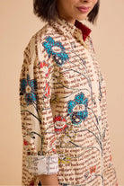 This one-size beige vintage newspaper floral placement printed shirt features intricate all-over thread detailing on the front and sleeves. A stylish, timeless piece that pairs perfectly with wide-leg trousers or shorts for a chic, effortless look.