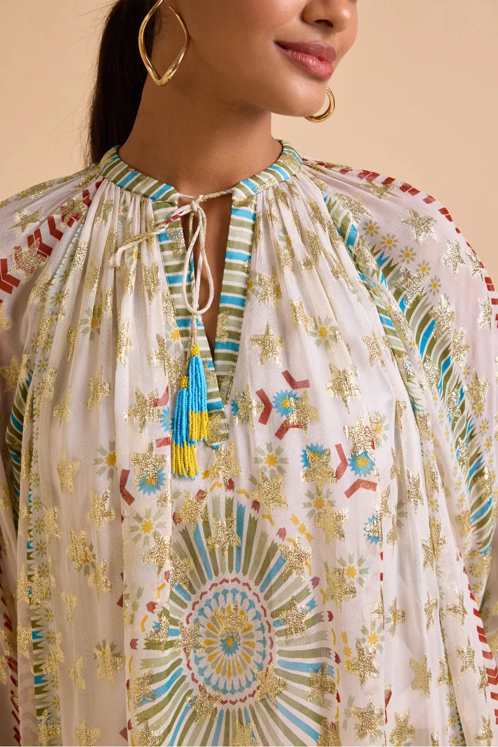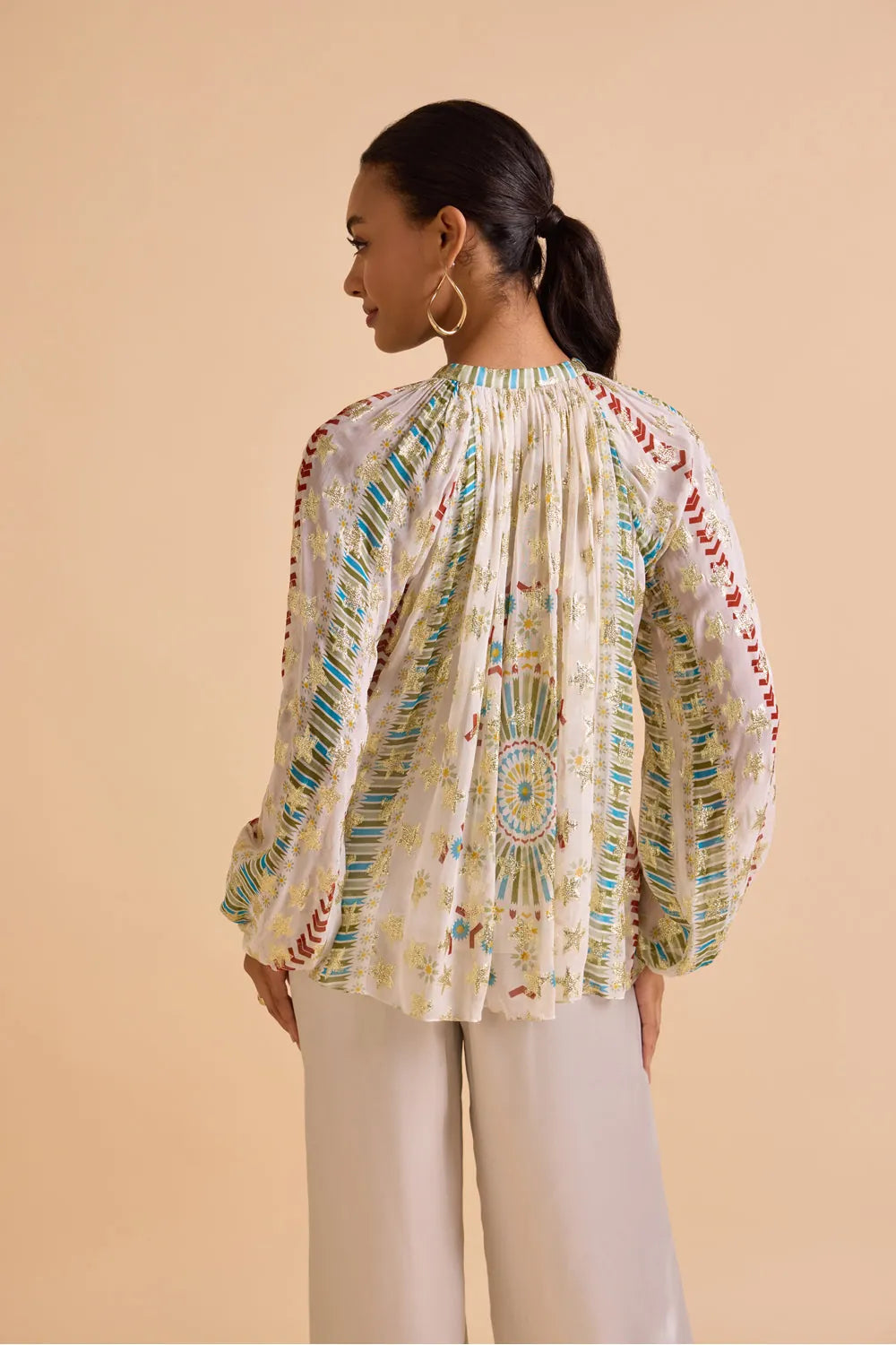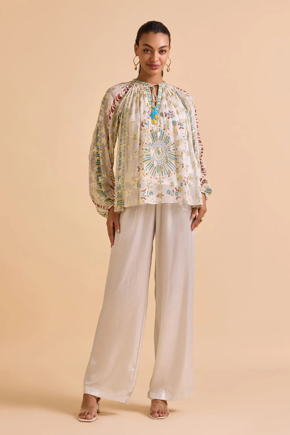 This ivory geometric printed jacquard blouse features a beaded tassel tie-up, adding a chic and playful touch to its elegant design. Perfect for elevating your everyday or evening look.