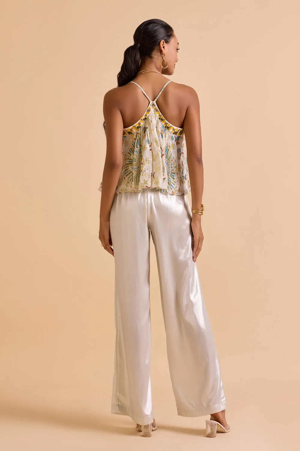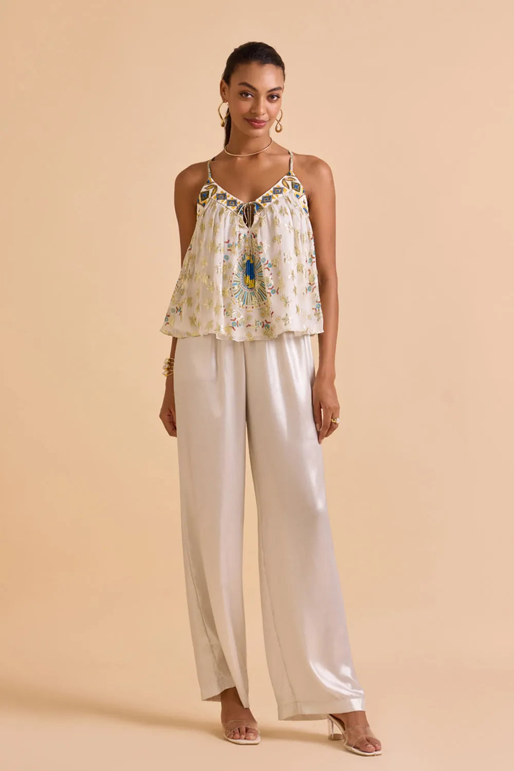 This ivory geometric printed jacquard blouse features a beaded embroidered neckline, blending classic elegance with modern design. Ideal for both casual and semi-formal occasions.