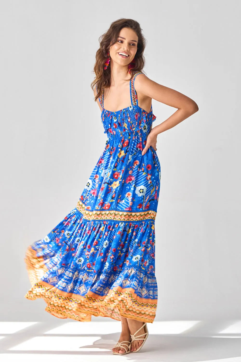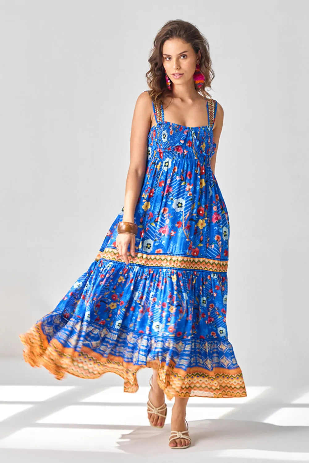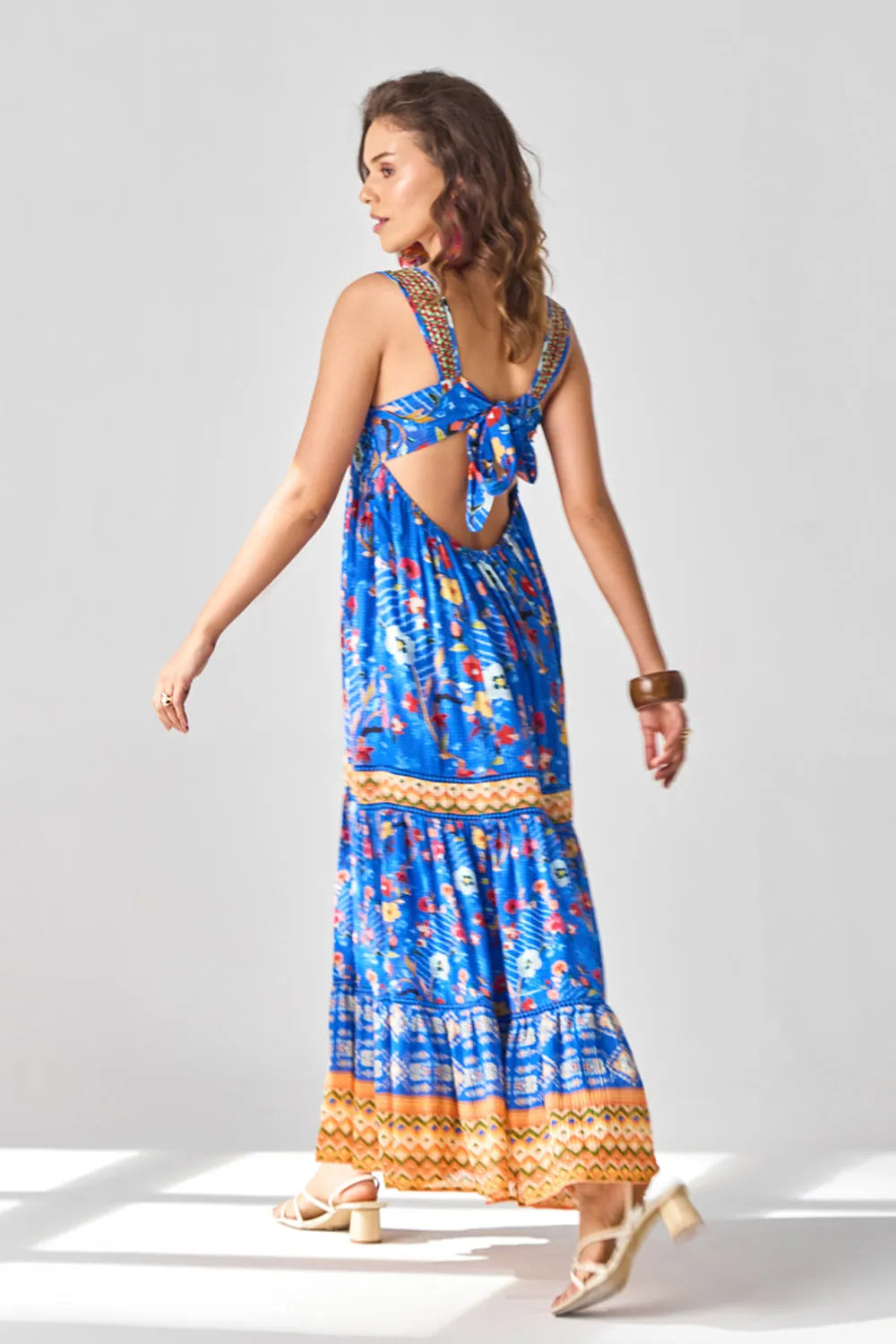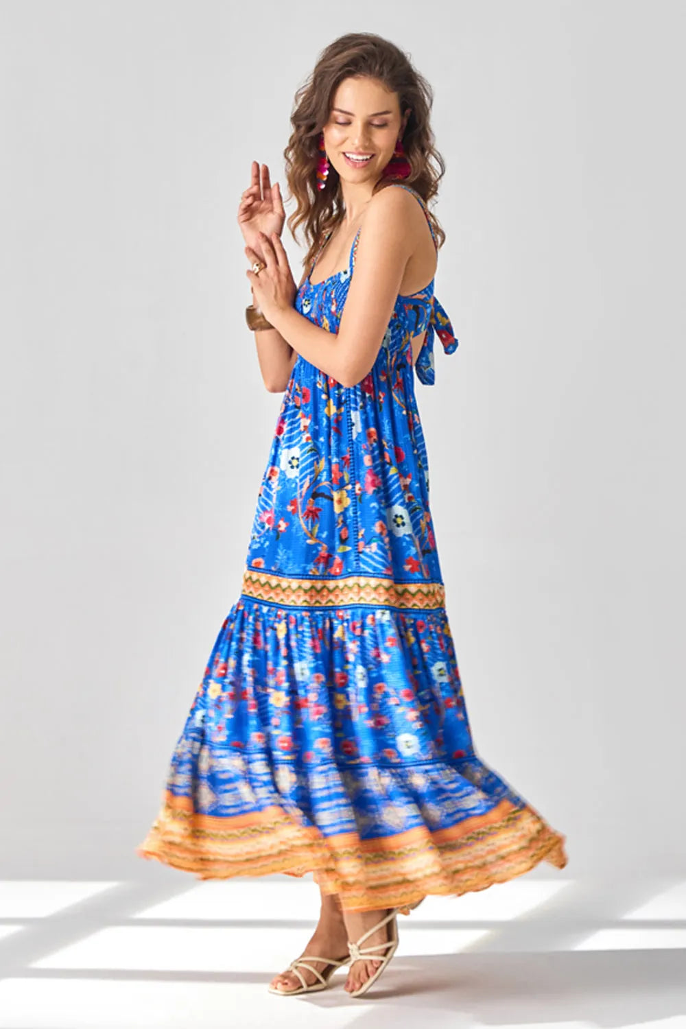 This cobalt blue floral printed maxi dress features a flattering tie-up back detailing, making it a stunning choice for summer. Light, breezy, and perfect for holidays, it’s your go-to dress for effortless style and comfort.