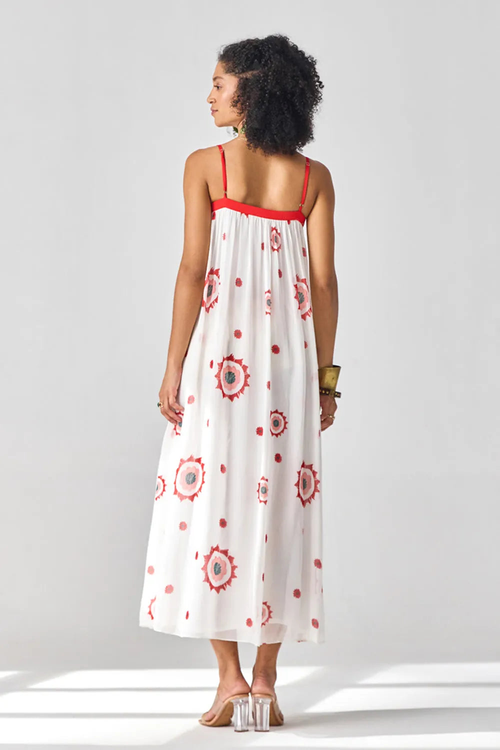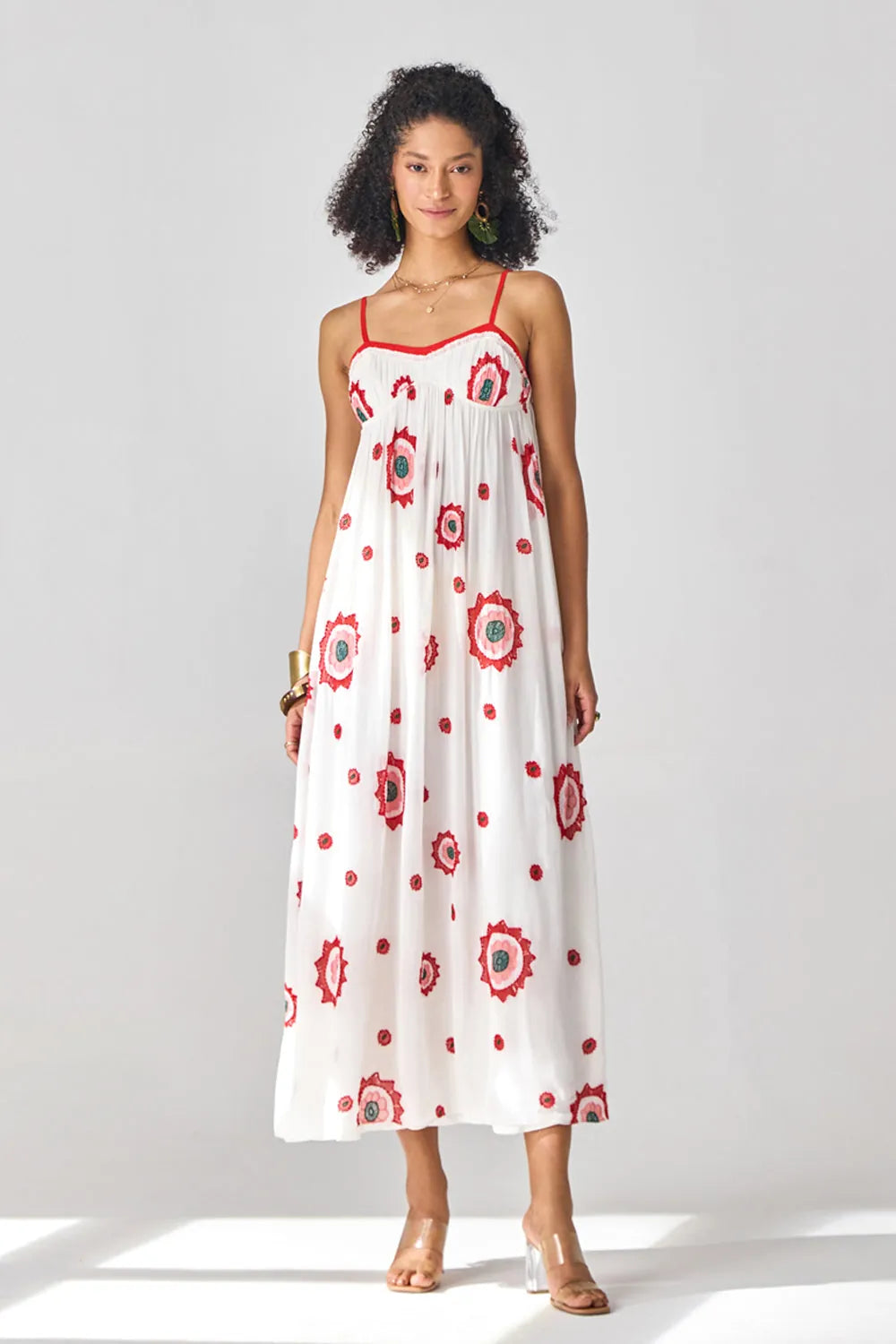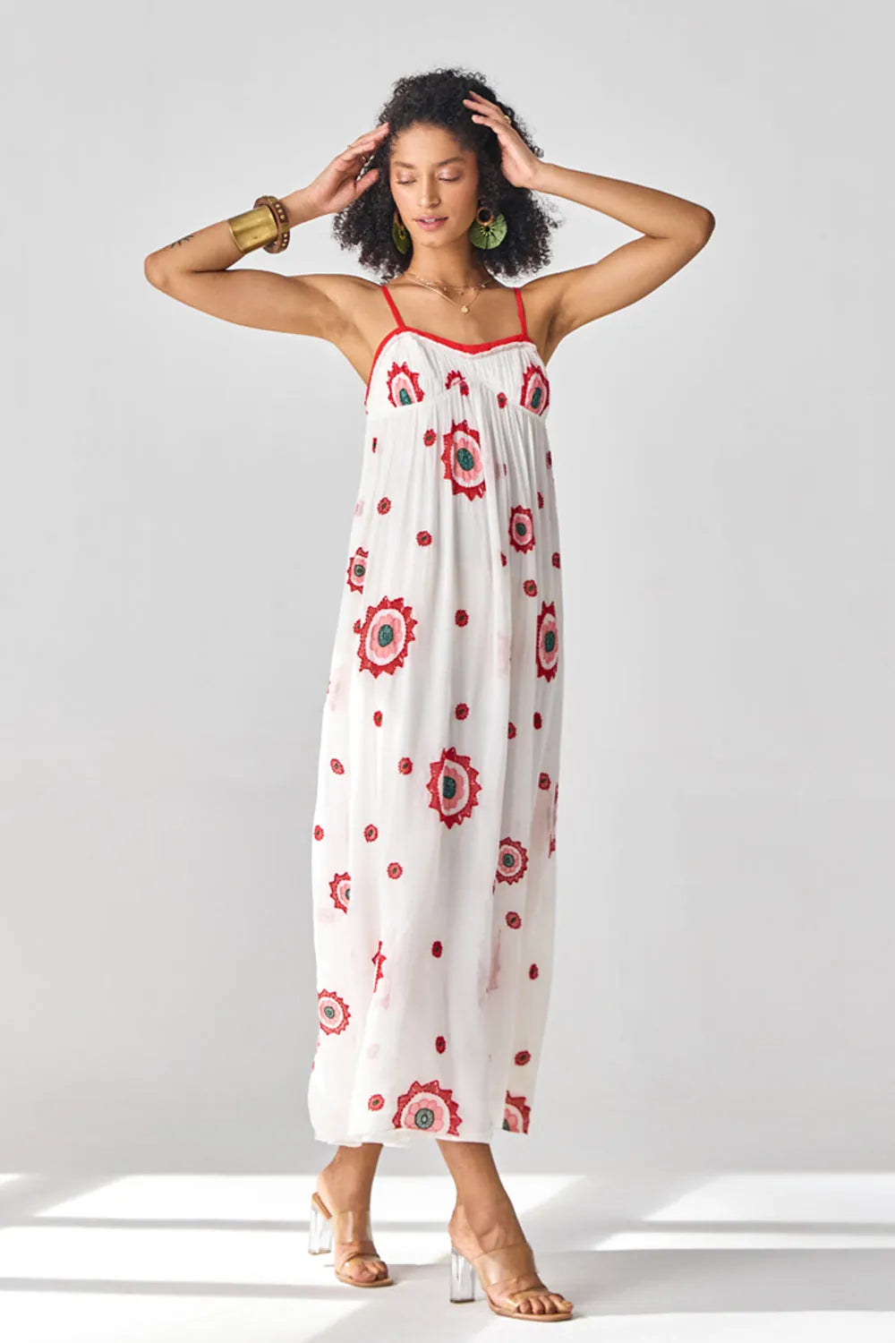 This flirty floral embroidered georgette maxi dress is the perfect choice for a lunch date. Light, airy, and full of charm, it adds a touch of romance to any outing.