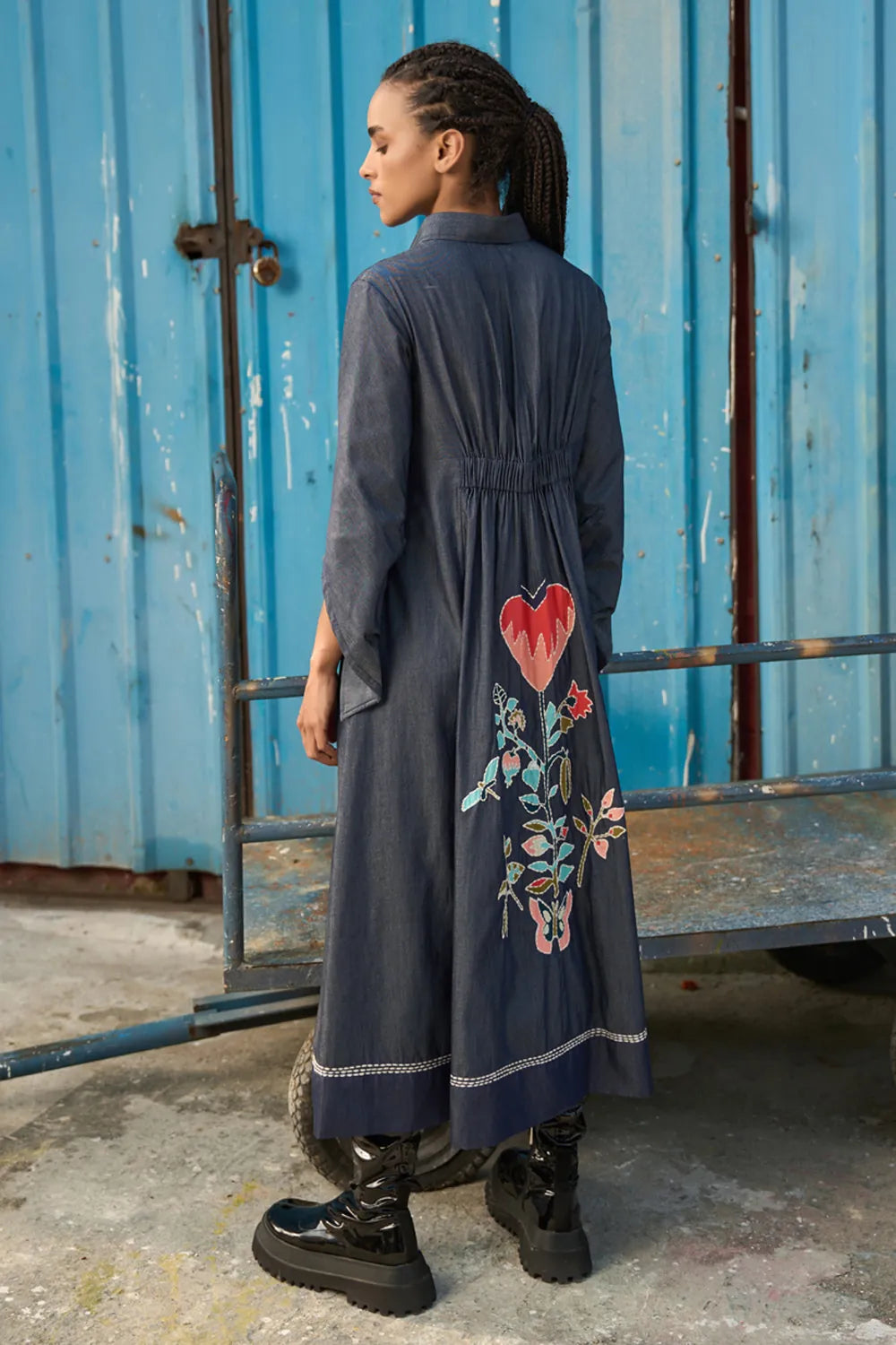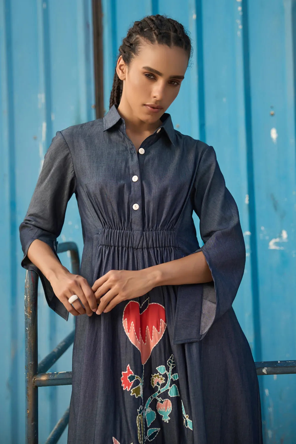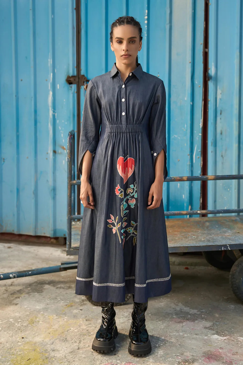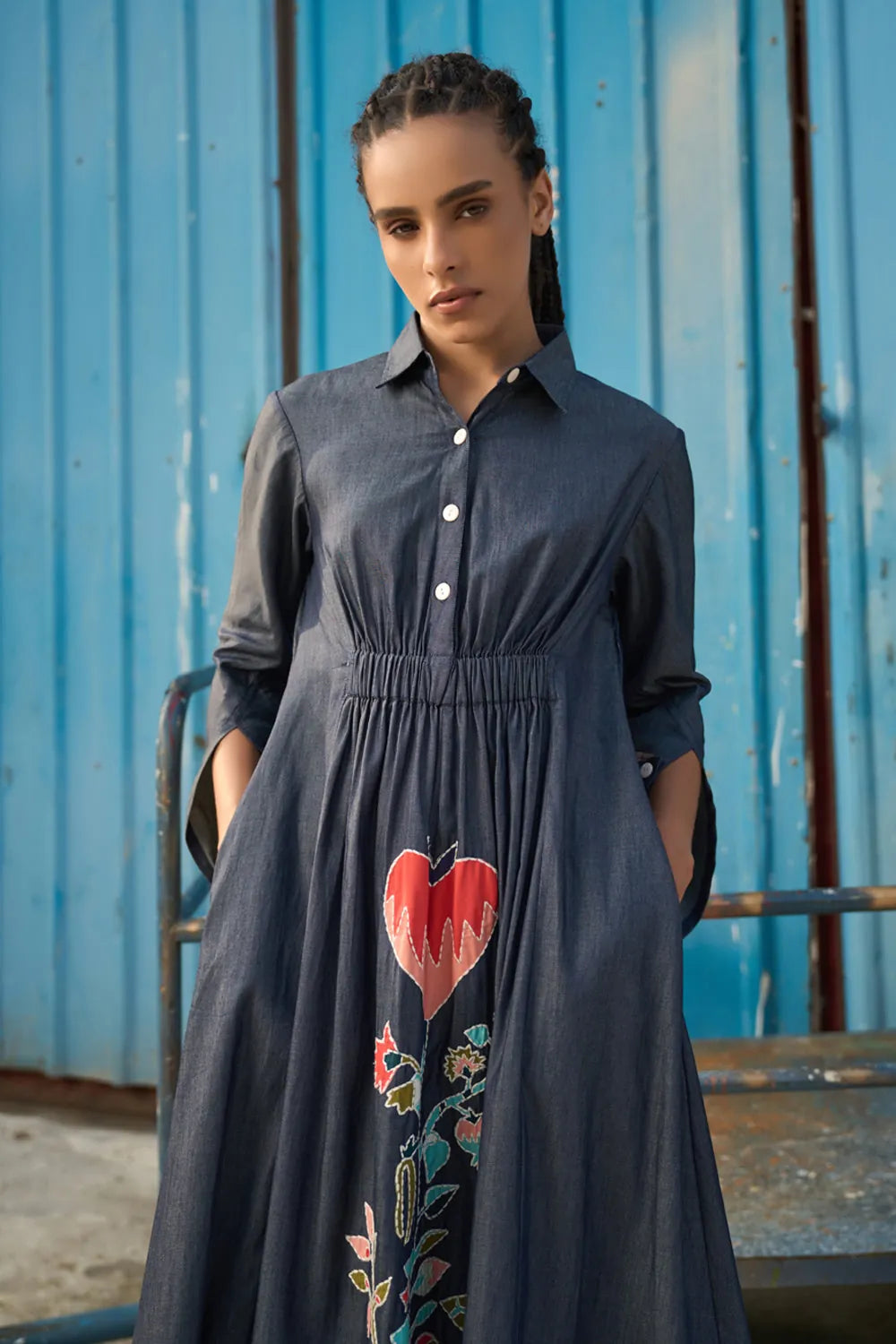 This denim blue midi shirt dress featuring a collared neckline, button-down front, and slightly flared sleeves with button details at the cuffs cinches at the waist with elastic ruching, creating a flattering silhouette. A large, bold embroidered heart and floral design decorates the front, adding a playful and artistic touch. The hem is finished with contrast stitching for added detail. Perfect for casual outings, dinners and day to night wear.