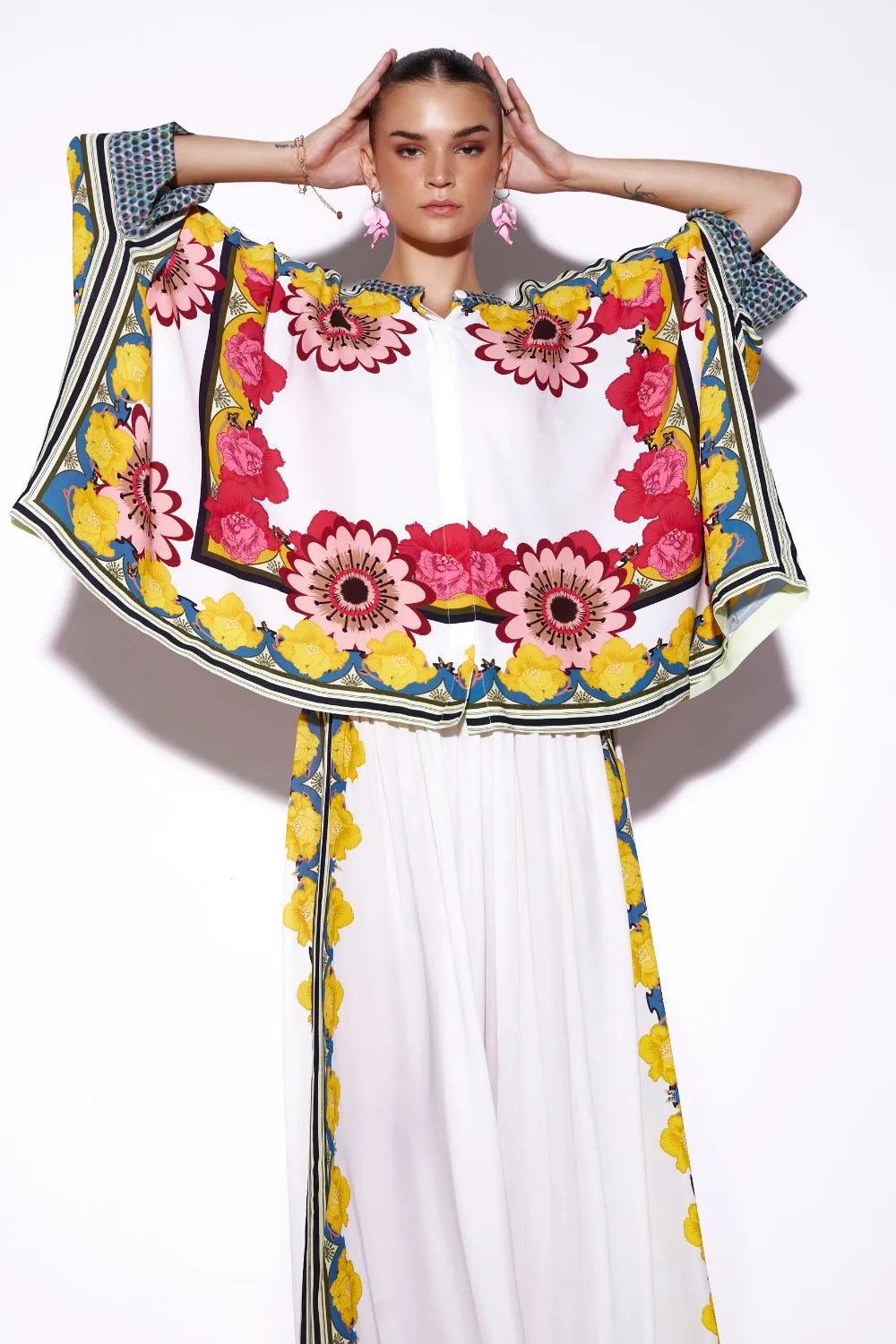 Elevate your look with our Aaloka Cape Blouse featuring a beautiful and elegant floral design. This blouse is perfect for any occasion and is sure to make a statement. (Flower power at its finest!)