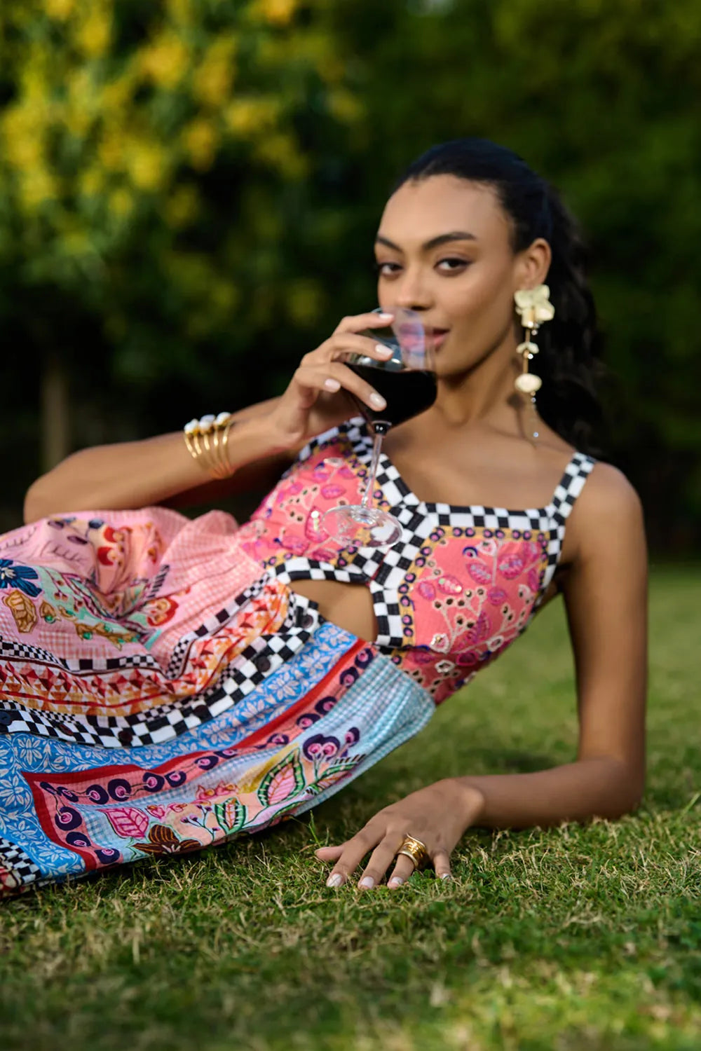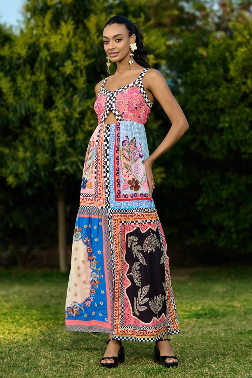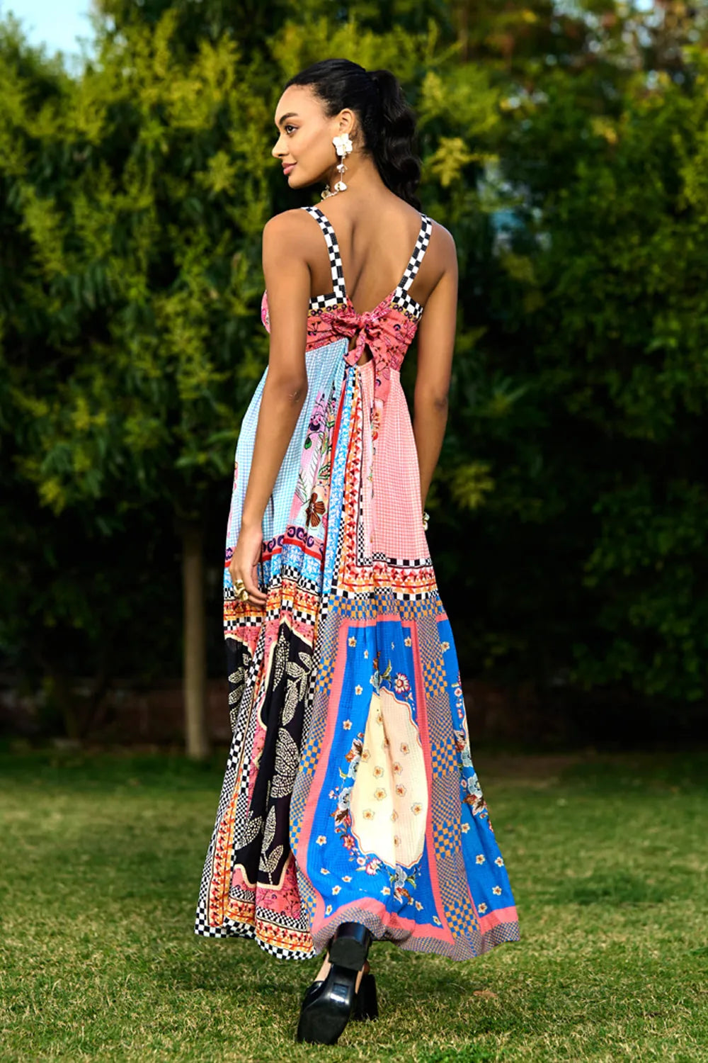 This color-blocked embroidered maxi dress features a flattering back tie-up, making it the perfect choice for special summer occasions. Elegant, vibrant, and effortlessly chic.