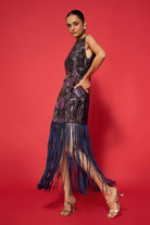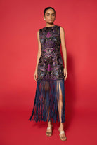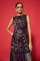 This is a sleeveless, fitted cocktail dress with heavy embellishment. The upper part of the dress features intricate embroidery and sequin detailing in rich jewel tones like purple, blue, and black, creating a regal and artistic pattern. The bottom of the dress is designed with long fringe tassels that add movement and drama. Perfect for evening cocktails or social gatherings.