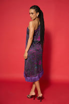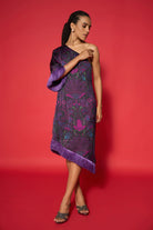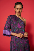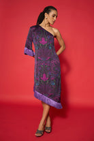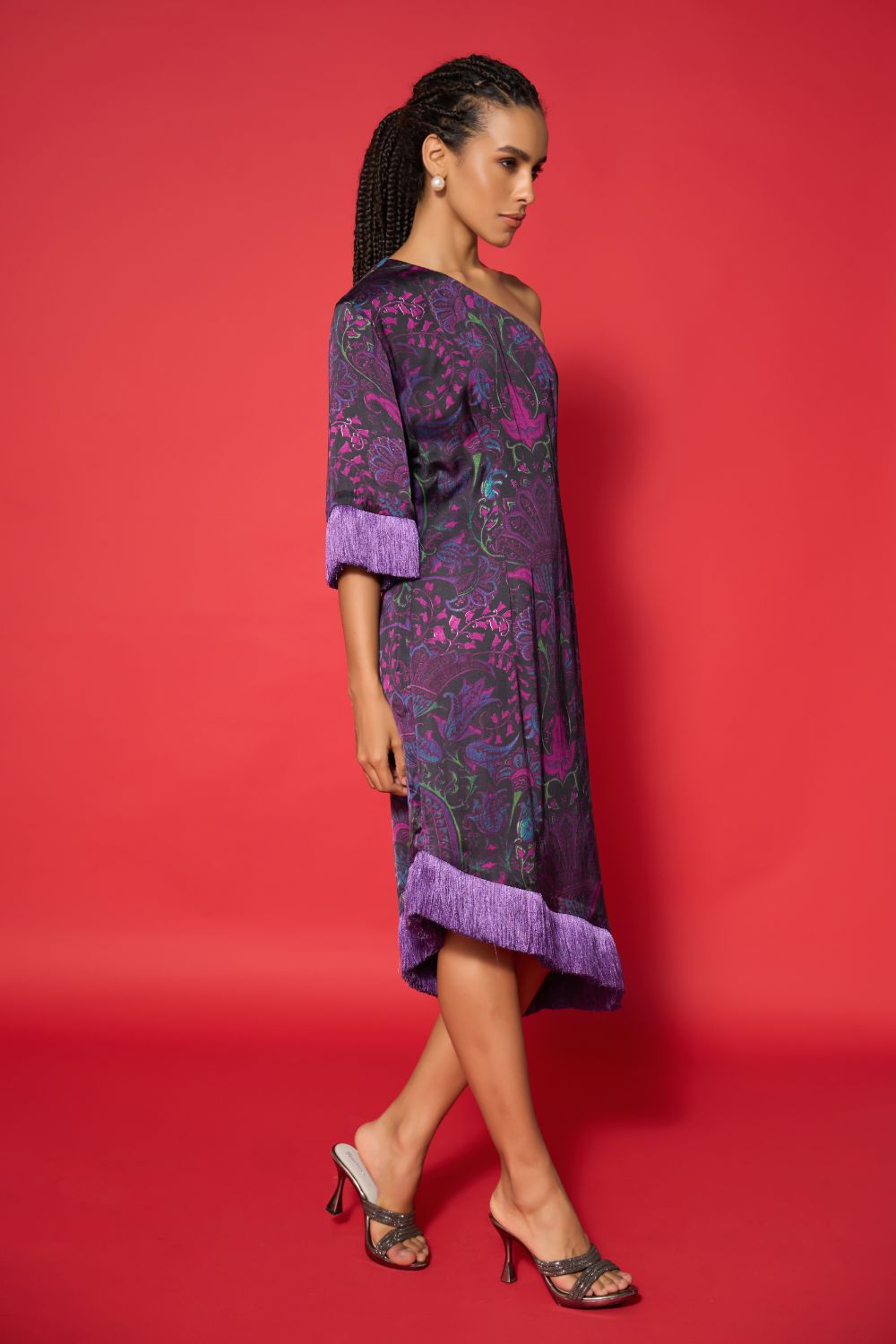 This is a one-shoulder asymmetric dress with a striking bohemian-inspired print. Its unique feature is the purple fringe detailing along the hem and sleeve edge. The silhouette is chic yet relaxed, blending modern sophistication with artistic flair. Perfect for cocktail parties, Outings and social gatherings.