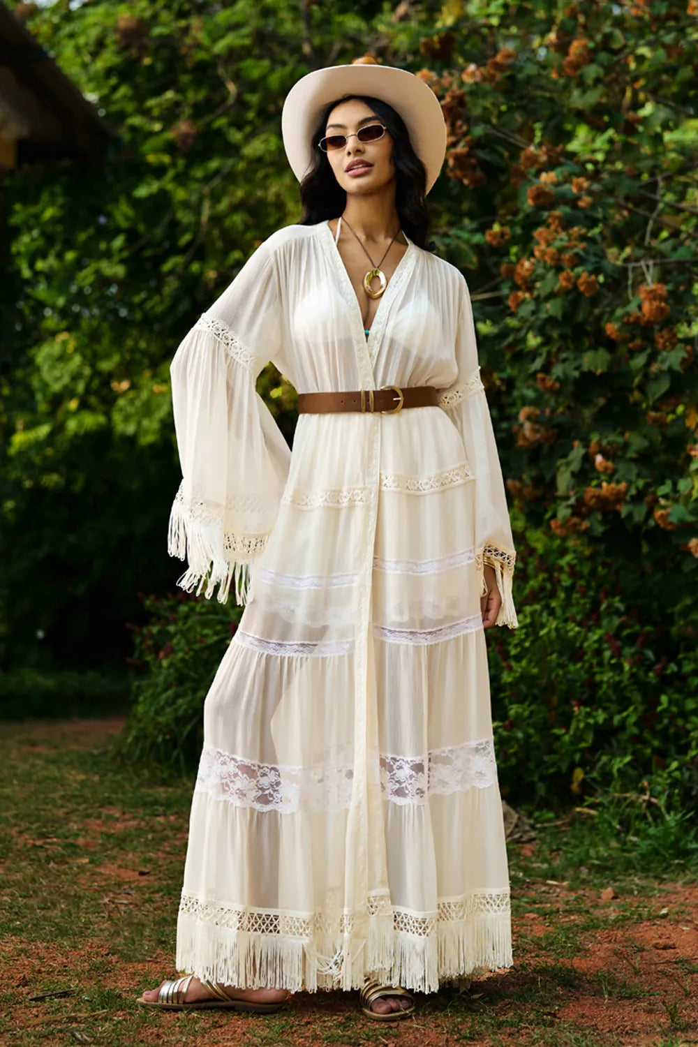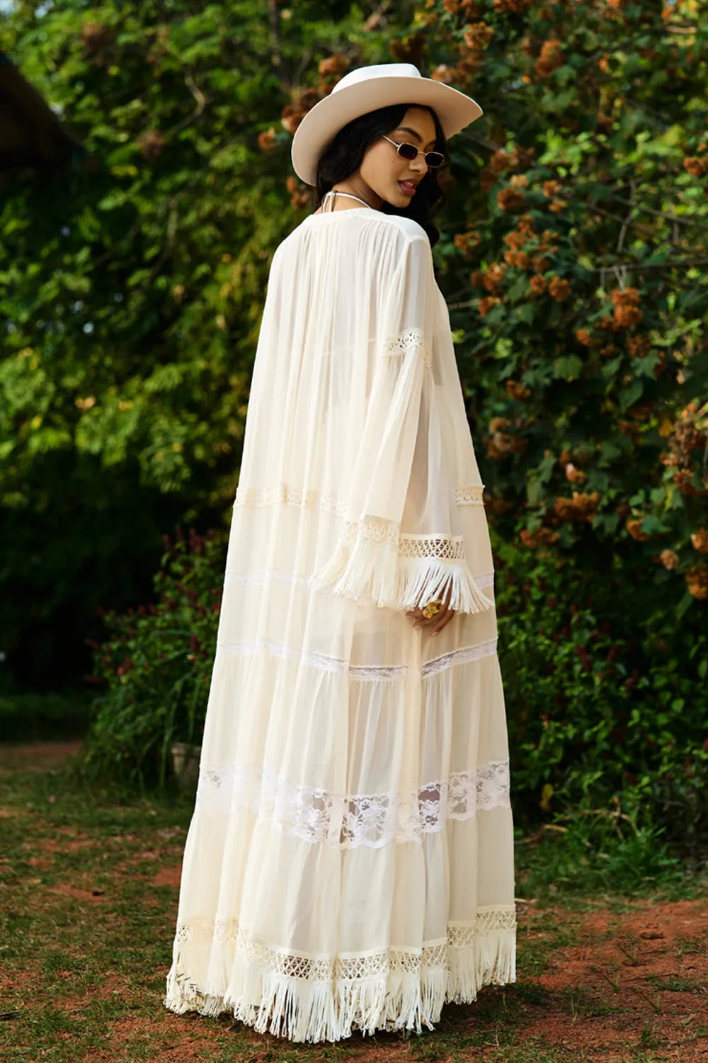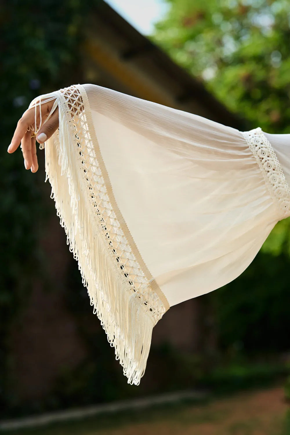 Effortlessly stylish, this ivory cape features lace details all over and is paired with lace detailing shorts to give it a stylish look. Ideal for holidays and resort.