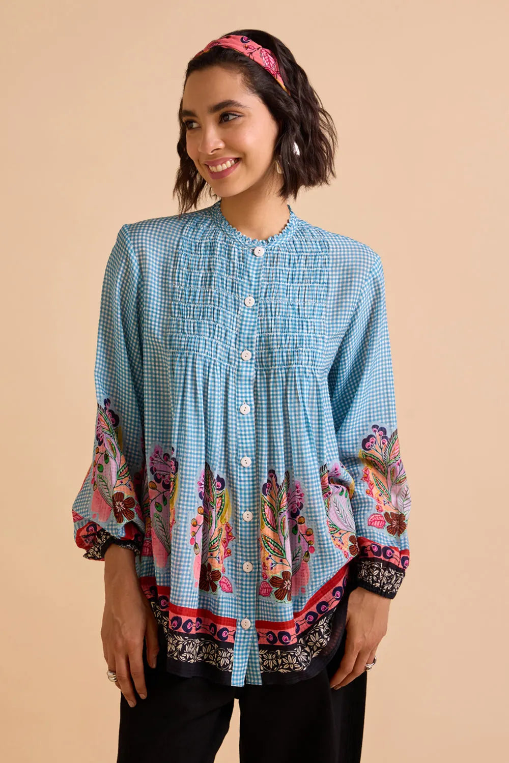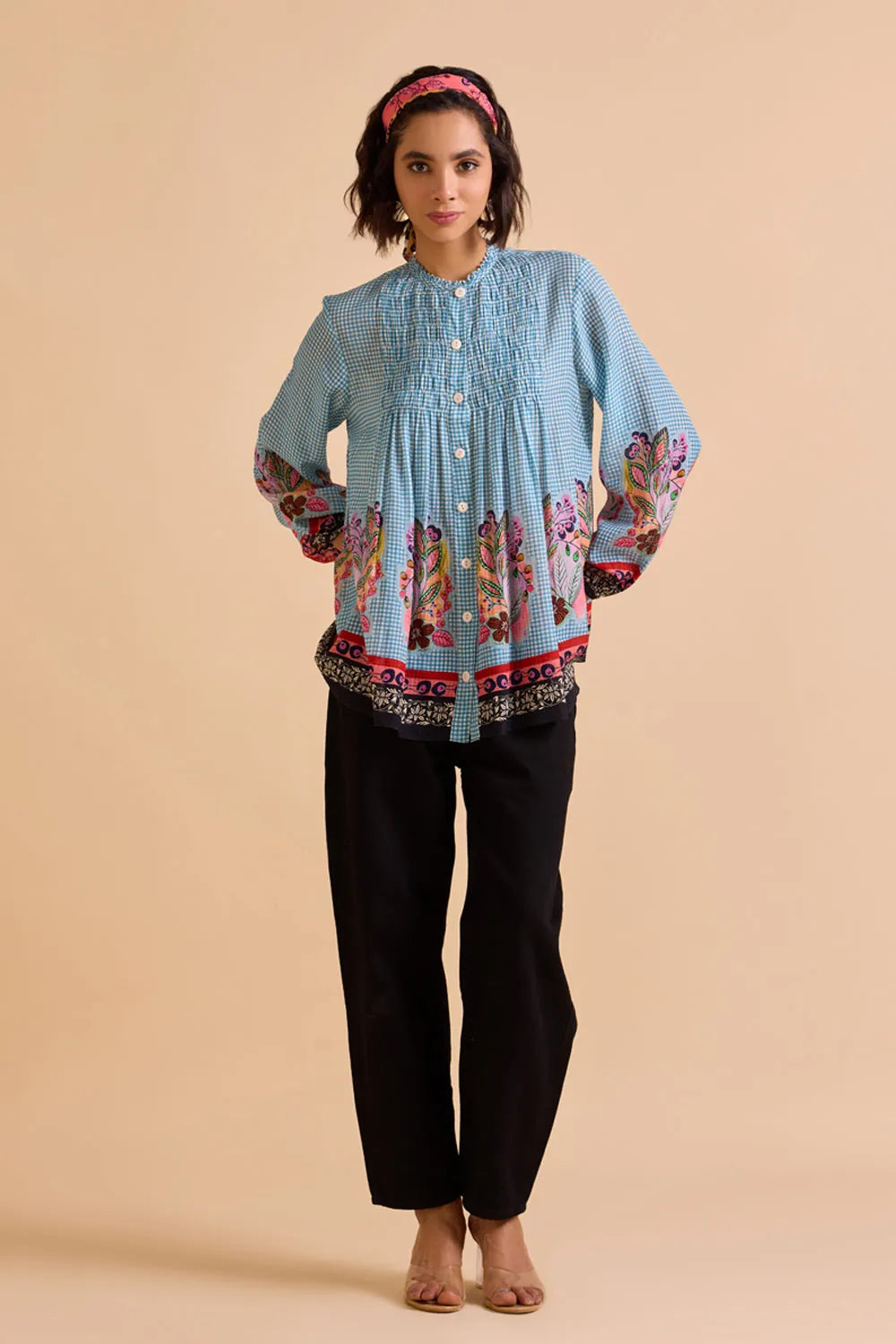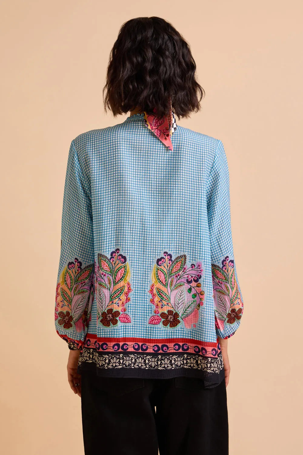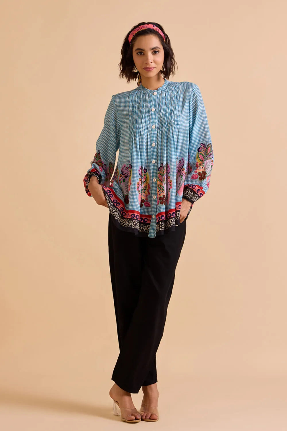 This front-open color-blocked checkish blouse is versatile and chic, perfect for layering or wearing on its own with trousers or shorts. Its bold design adds a stylish touch to any outfit.