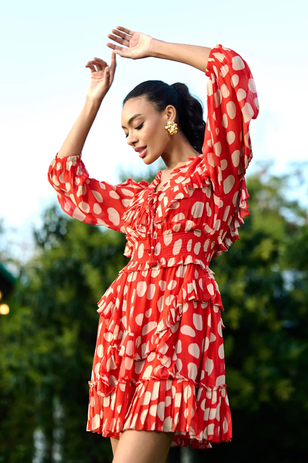 This coral red polka dot mini dress features playful ruffle detailing, a tie-up neck, and beaded tassels, adding a touch of charm and fun. Perfect for a sunny day or a casual outing with friends.