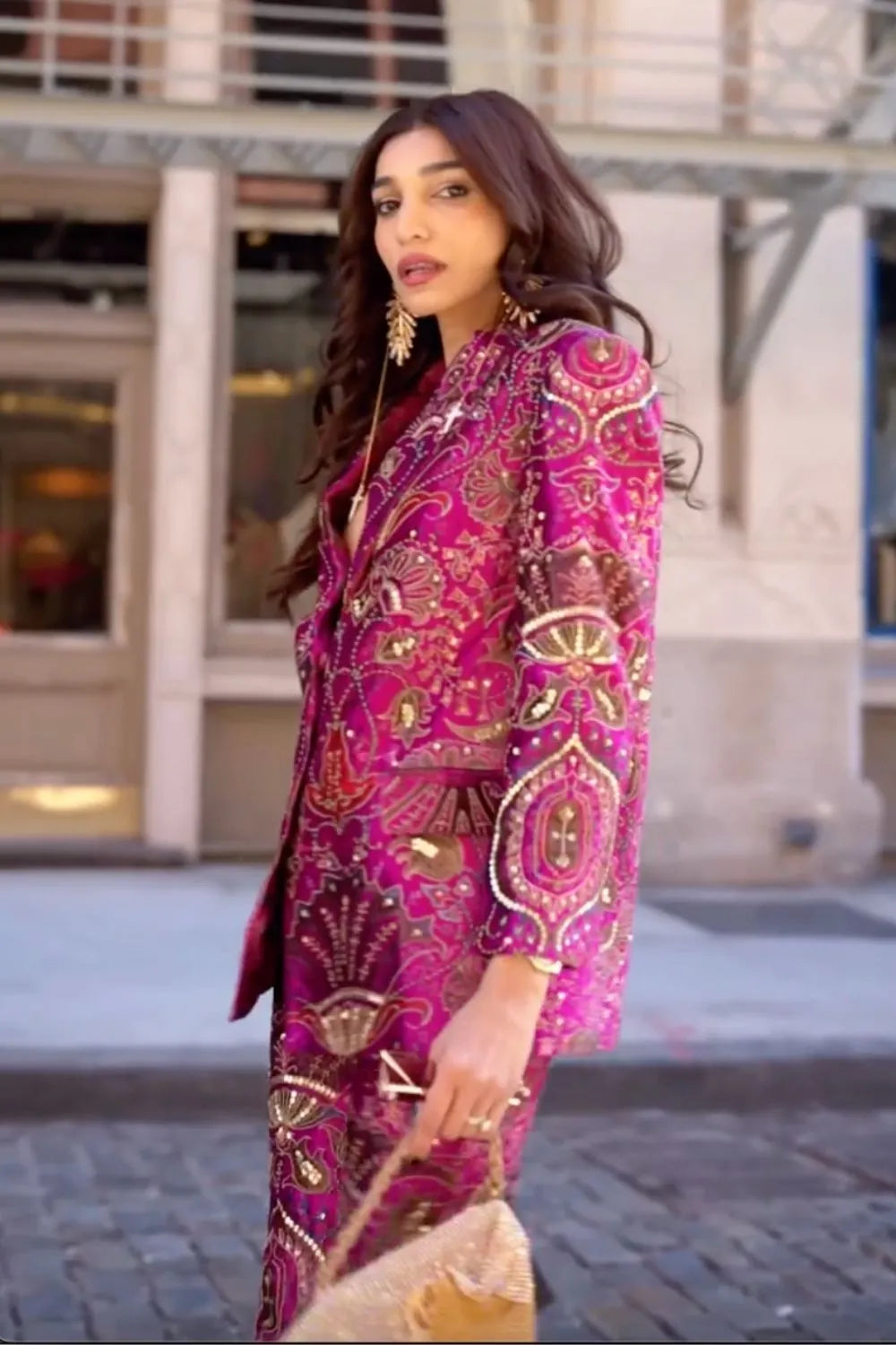 Make a bold statement with the Ramona Jacket & Pants Set. The ruby pink velvet fabric is adorned with thread sequence detailing, adding a touch of glamour and elegance. This co-ord set is perfect for parties, exuding a luxurious and sophisticated vibe. Pair it with a dress or high-waisted pants for a stunning and fashionable look.