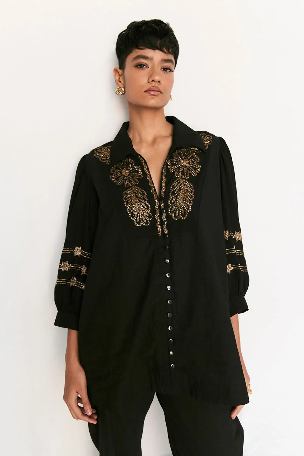 Beaded floral front button shirt with straight legged pants.