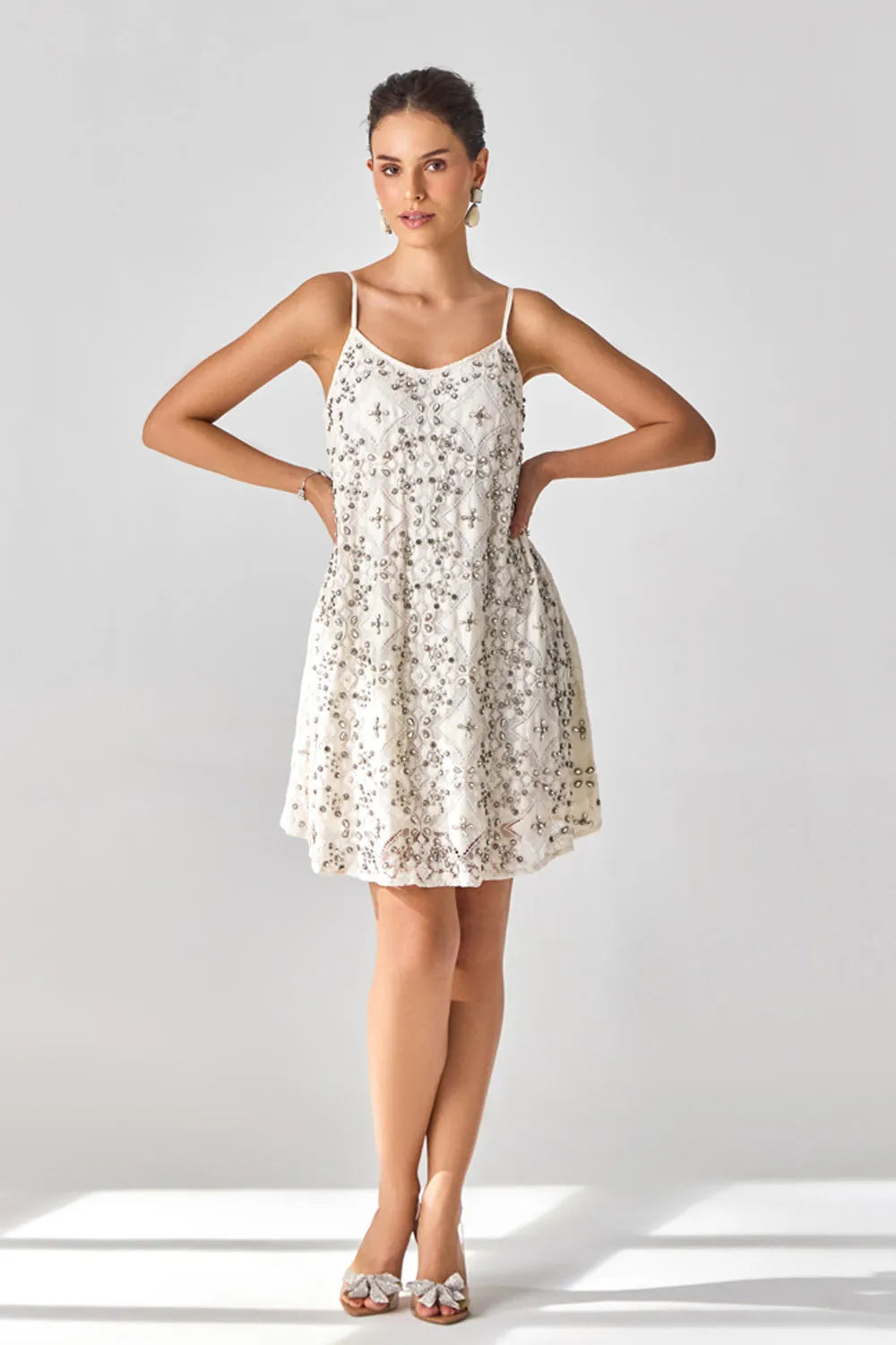 Sparkle at summer weddings and gatherings in this stunning ivory lace mini swing dress, adorned with crystal embellishments for a touch of glamour and elegance. Perfect for making a statement at any occasion.