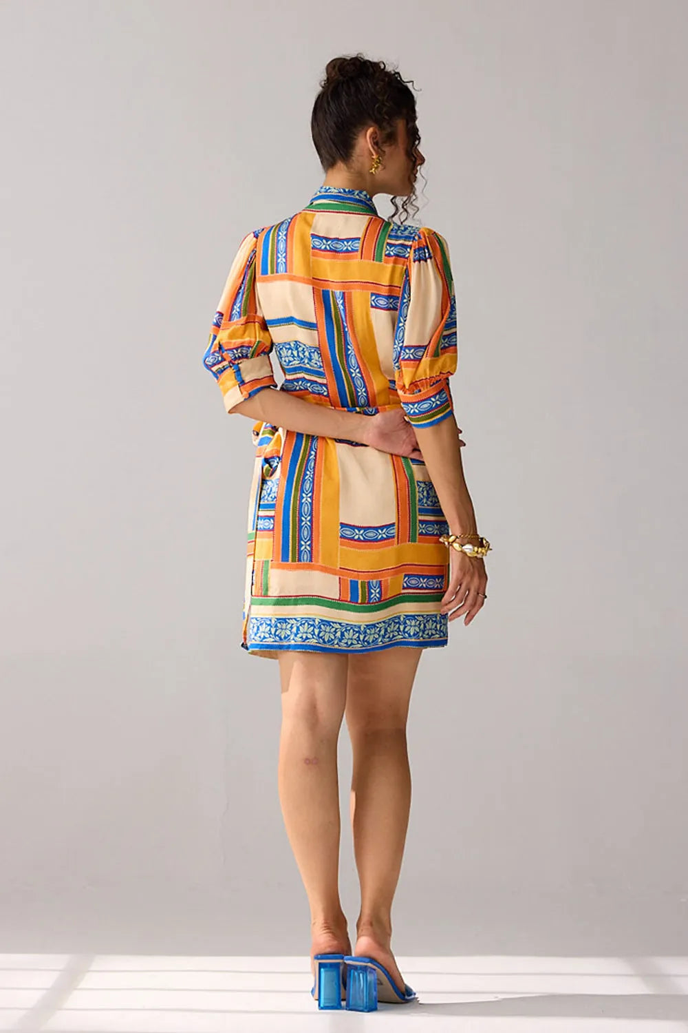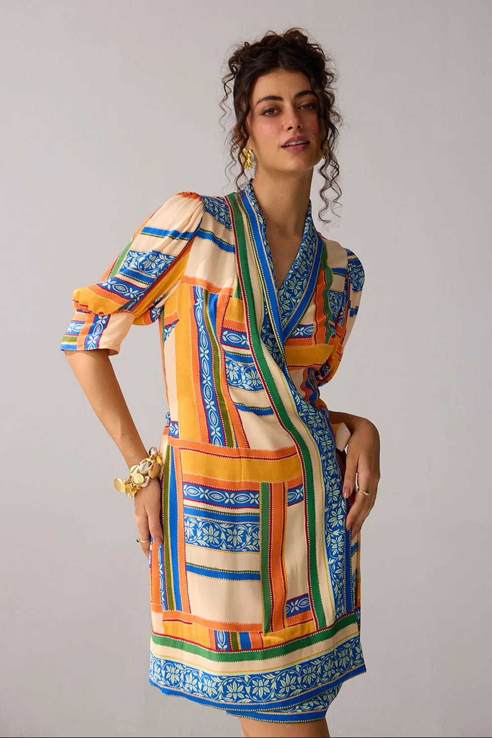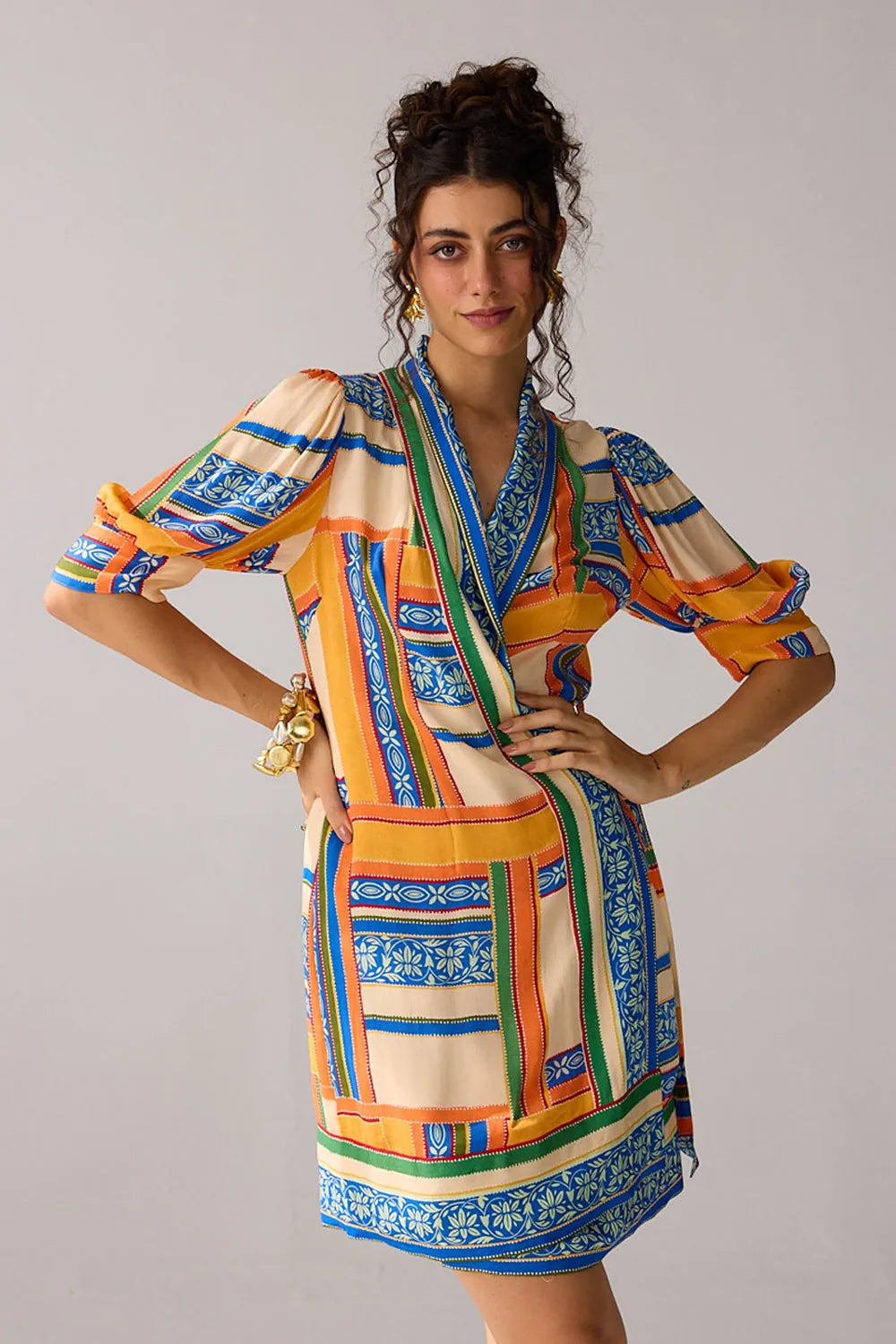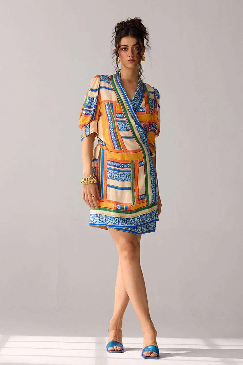 This graphic mini wrap dress is a perfect blend of style and versatility. Wear it to work or dress it down for a fun, playful vibe—ideal for any occasion.
