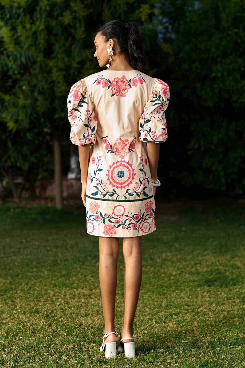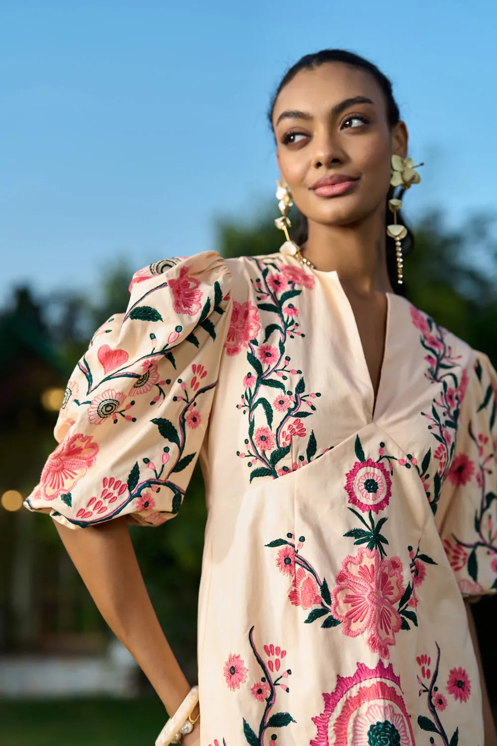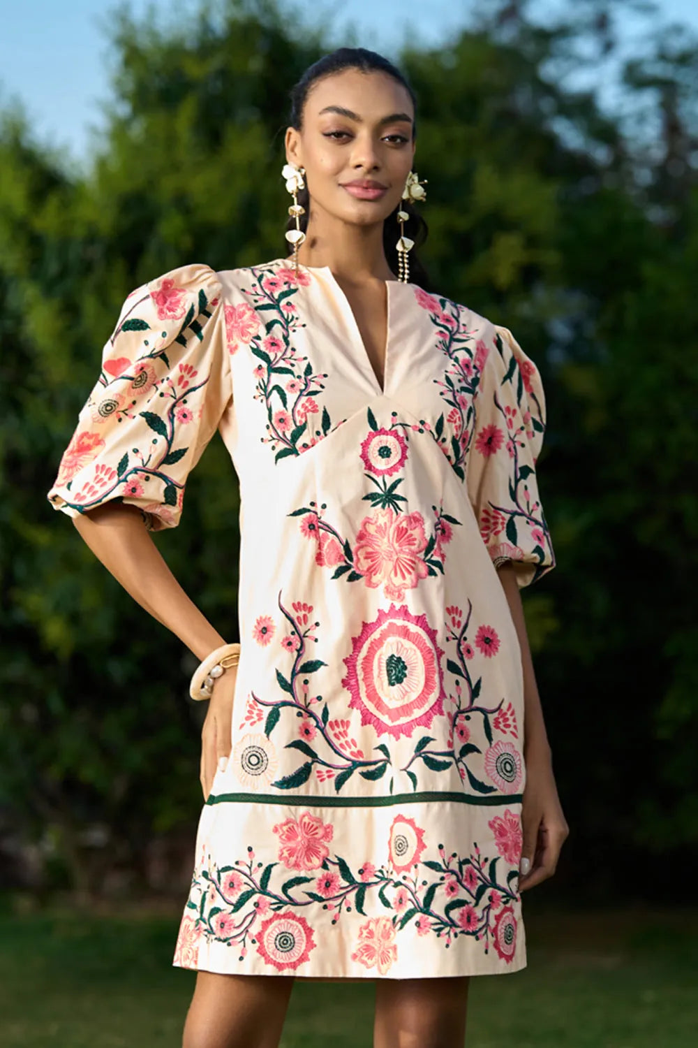 This embroidered tunic dress with a V-neck is a perfect blend of elegance and versatility. Ideal for a luncheon or day-to-night wear, it’s both chic and effortlessly stylish.