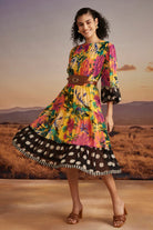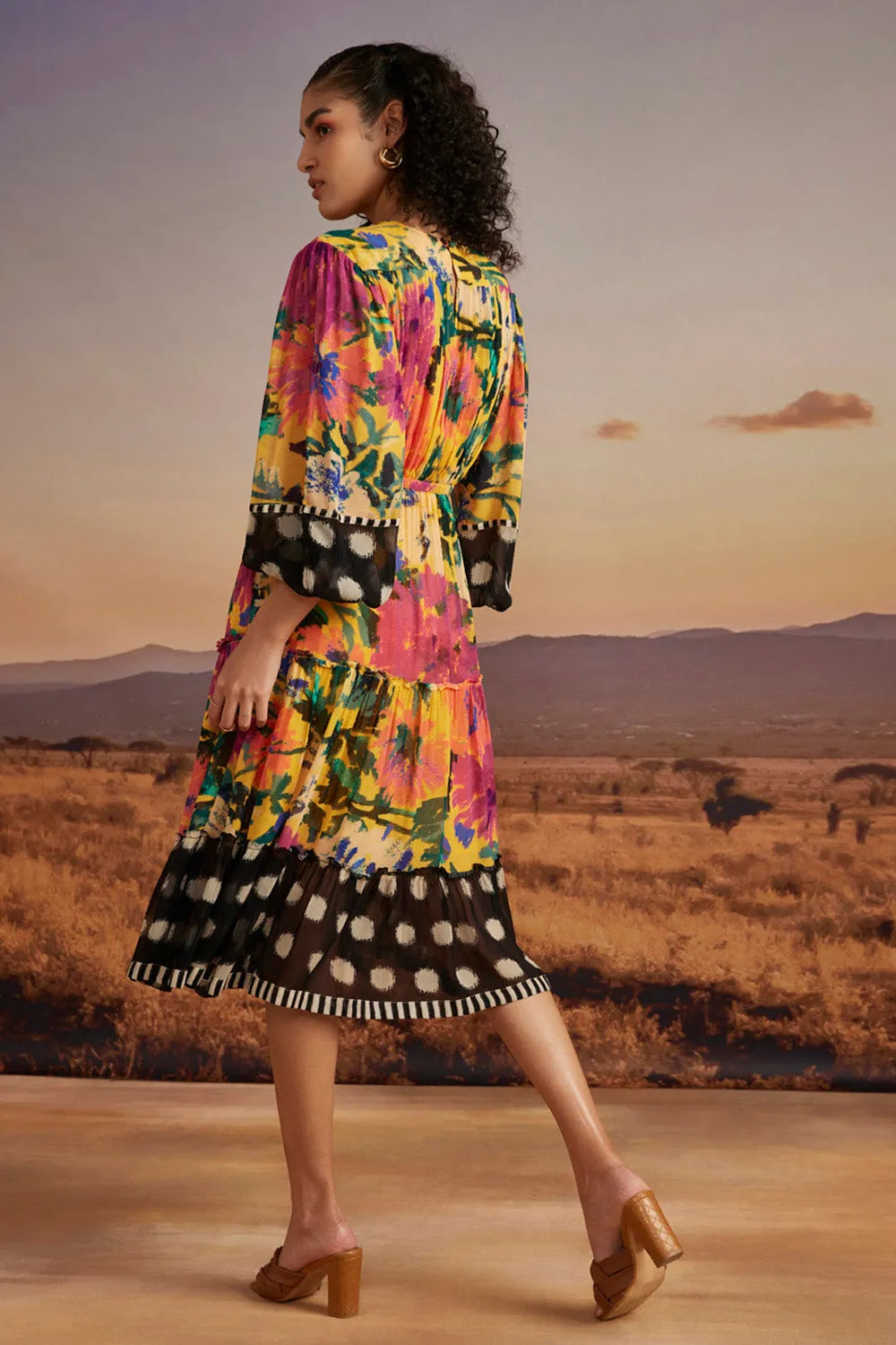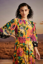 he Sia Midi Dress is all about pleats, ruching, and being effortlessly chic. Its mustard floral print makes a statement, while the viscose georgette fabric brings comfort to style.