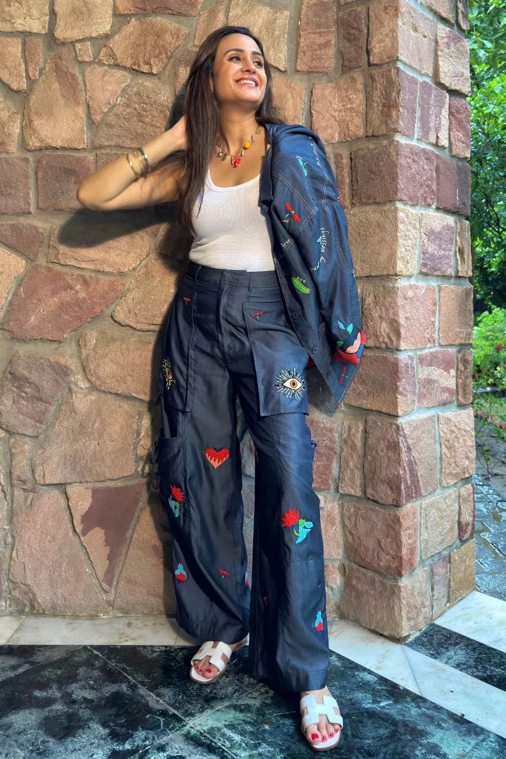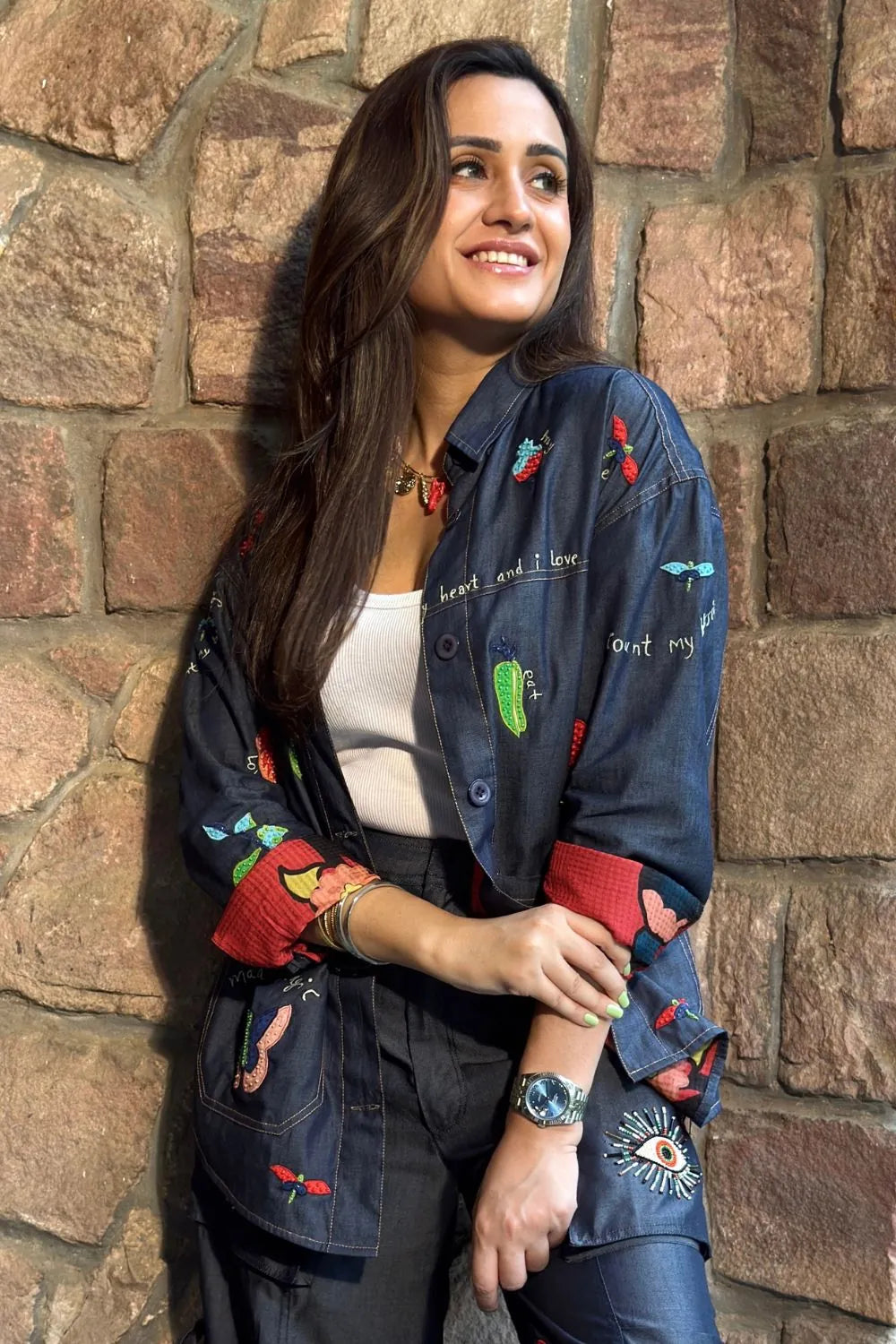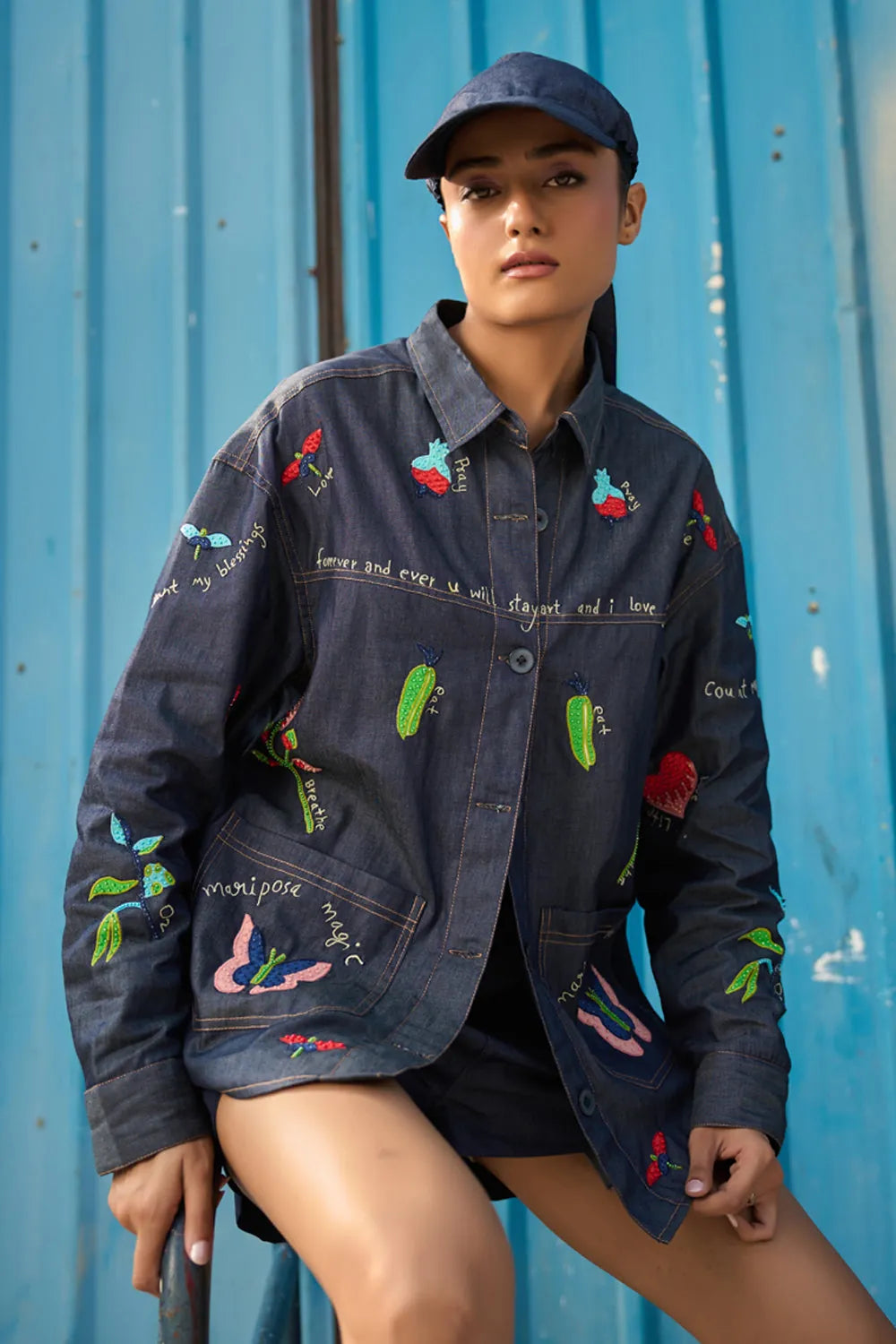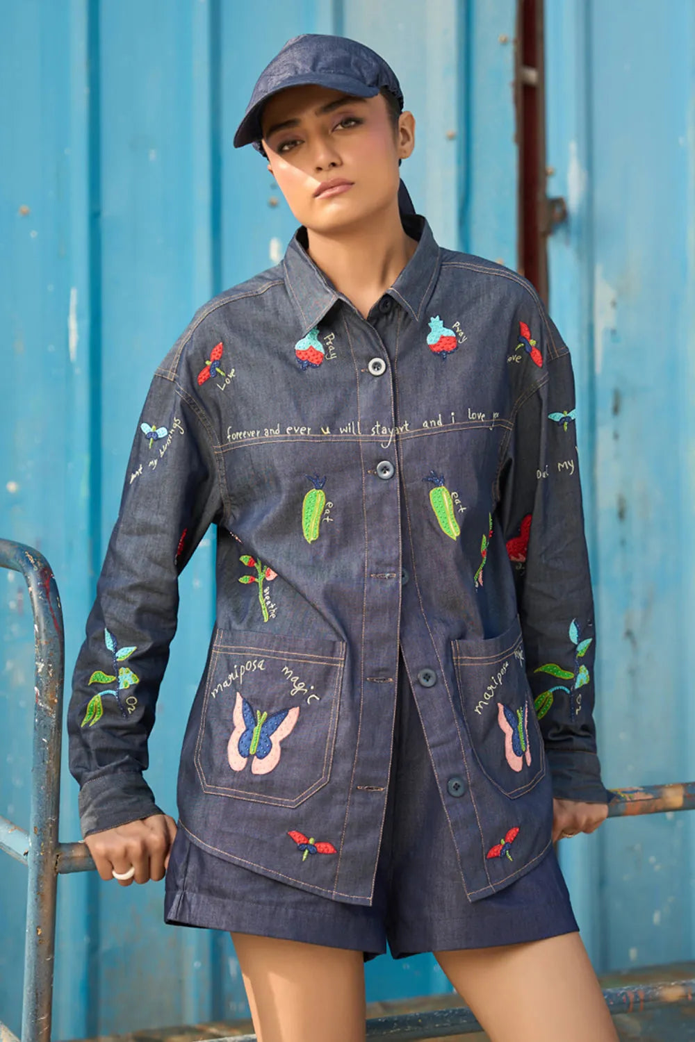 This is a dark denim button-down shirt featuring playful, colorful embroidery which includes butterflies, hearts, fruits, and small text phrases like “mariposa magic” and “forever and ever u will stay…”. The shirt has a structured yet relaxed fit with long sleeves and two oversized front patch pockets that also carry embroidered designs.