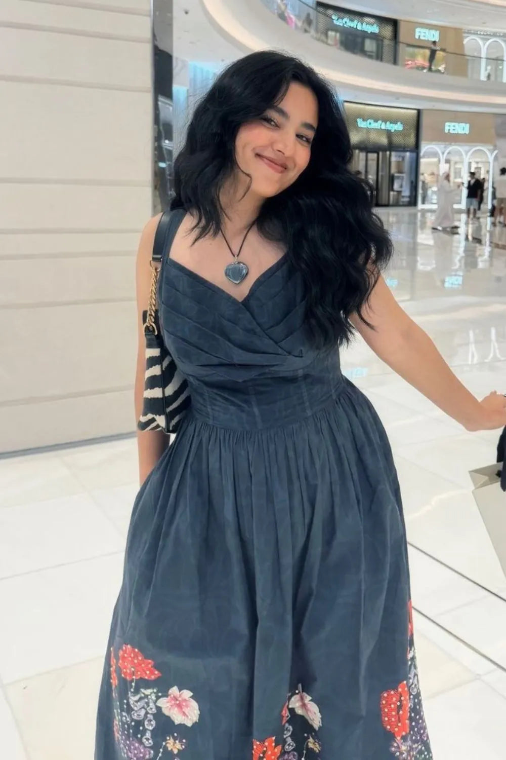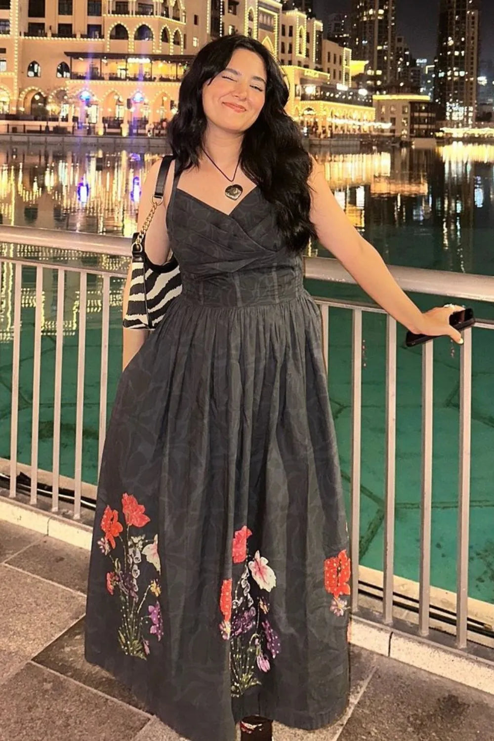 Radiate elegance in the Orsa Dress, featuring a sweetheart neckline and intricate bead detailing on a navy floral print. This cotton dress is a true work of art.