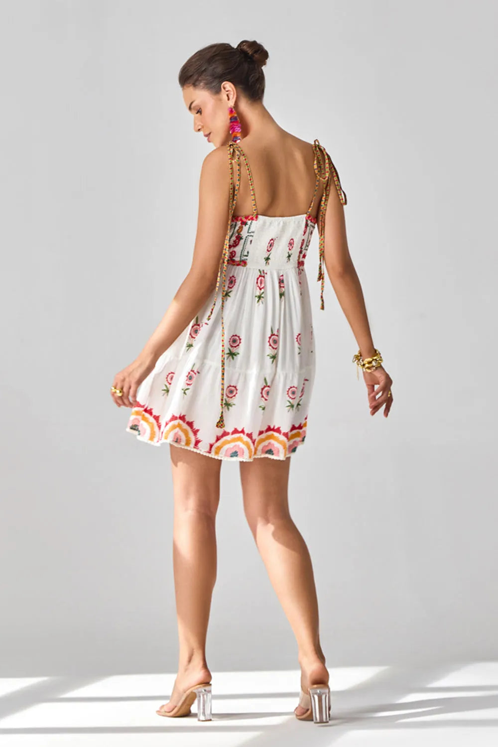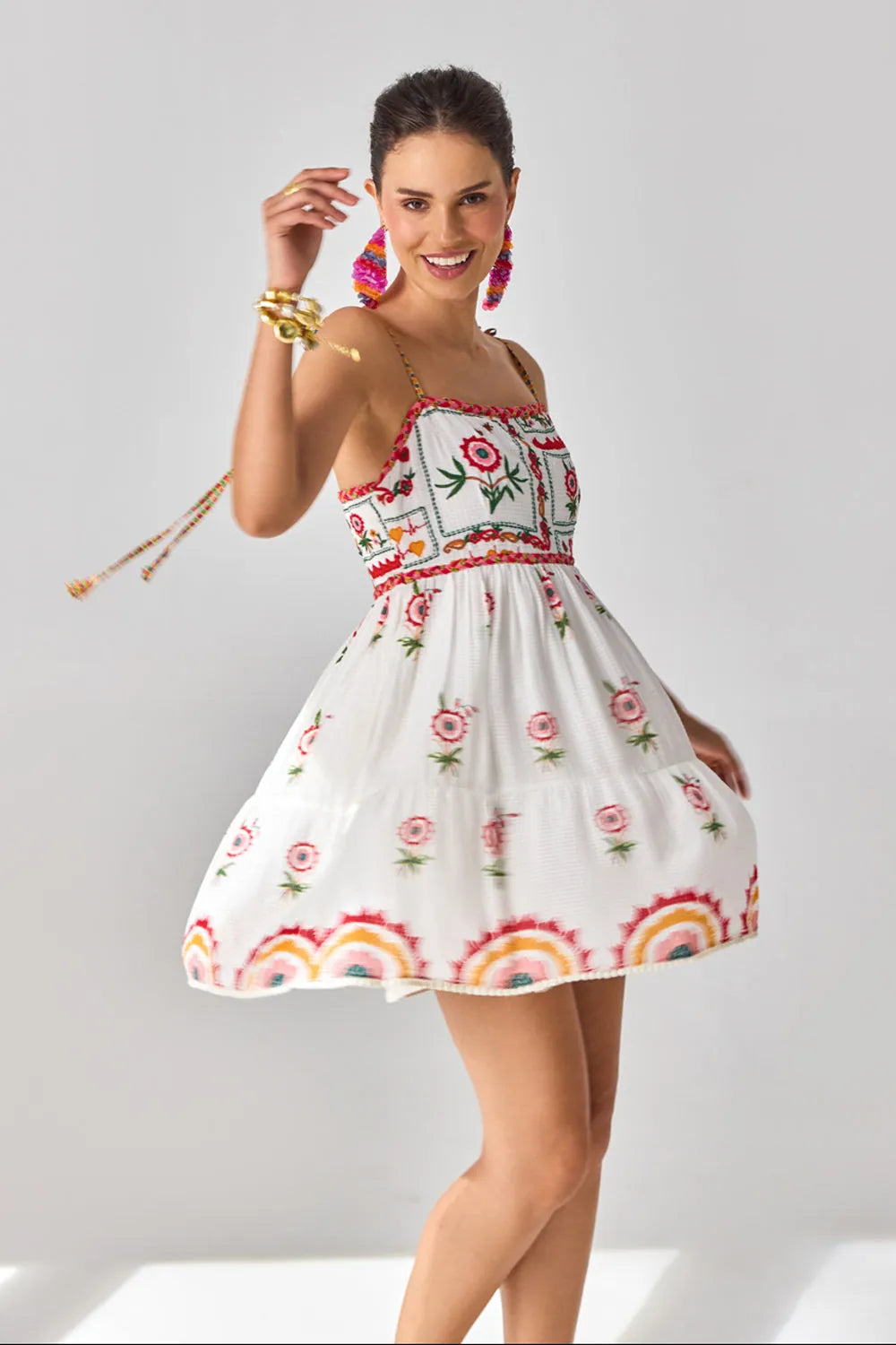 This flirty ivory mini dress in voile features an embroidered torso and delicate braided detailing, offering a playful yet elegant look. Perfect for adding a touch of charm to any occasion.