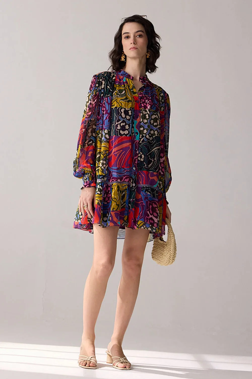 Brighten your wardrobe with our multicolored tunic dress, featuring elegant lace detailing. The vibrant print paired with delicate lace accents creates a stunning blend of colour and texture, making this a versatile pick.